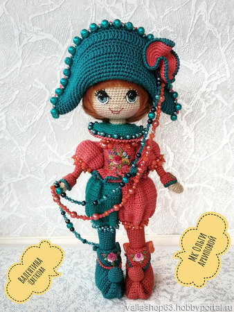 Интерьерная кукла, связана крючком из пряжи хлопок и украшена ручной вышивкой по вязаному полотну. Одежда не снимается. Стоит уверенно, на каркасе.