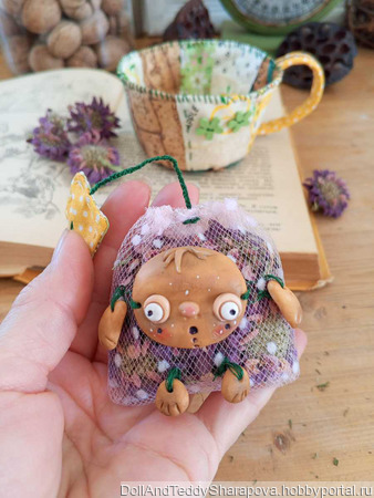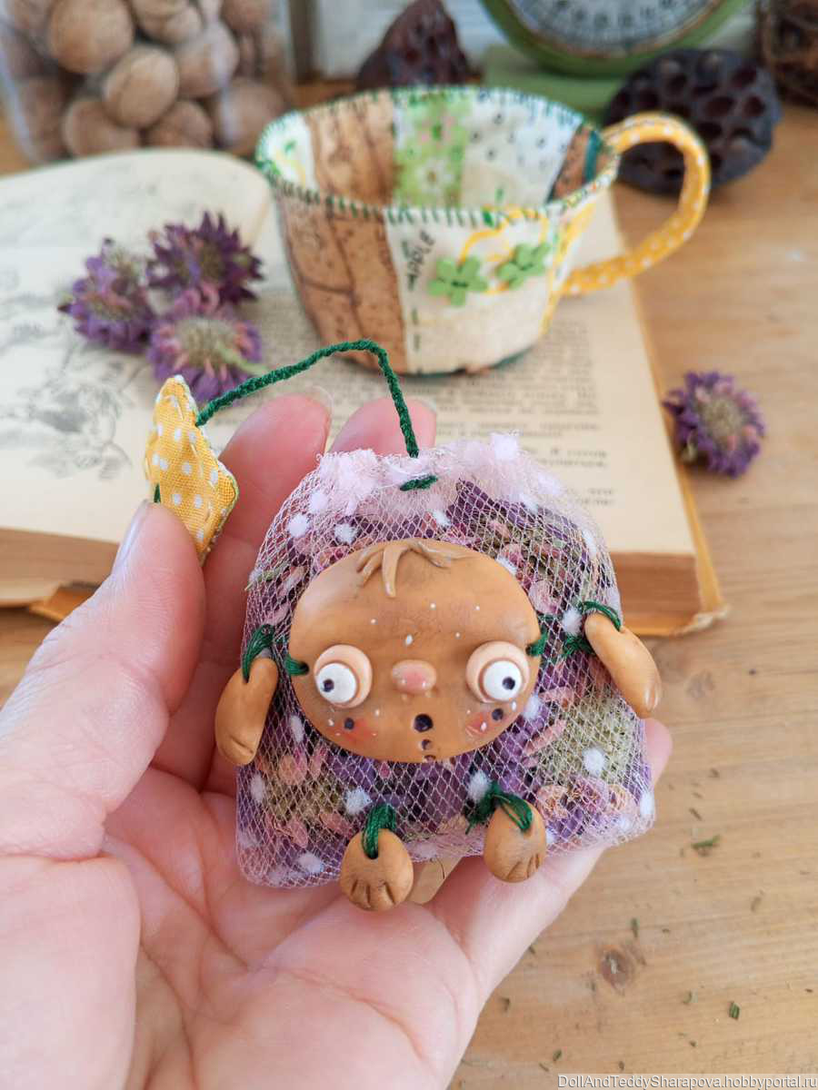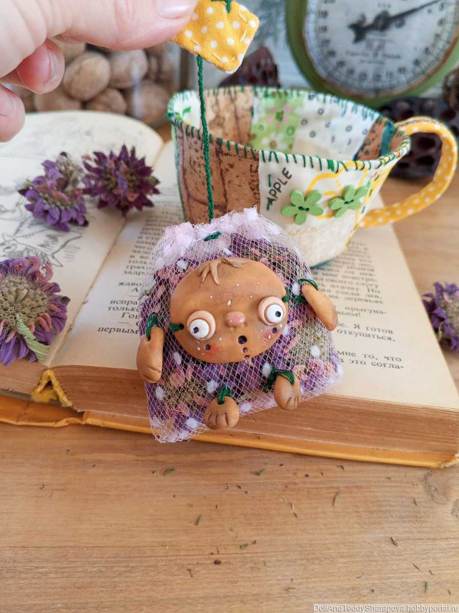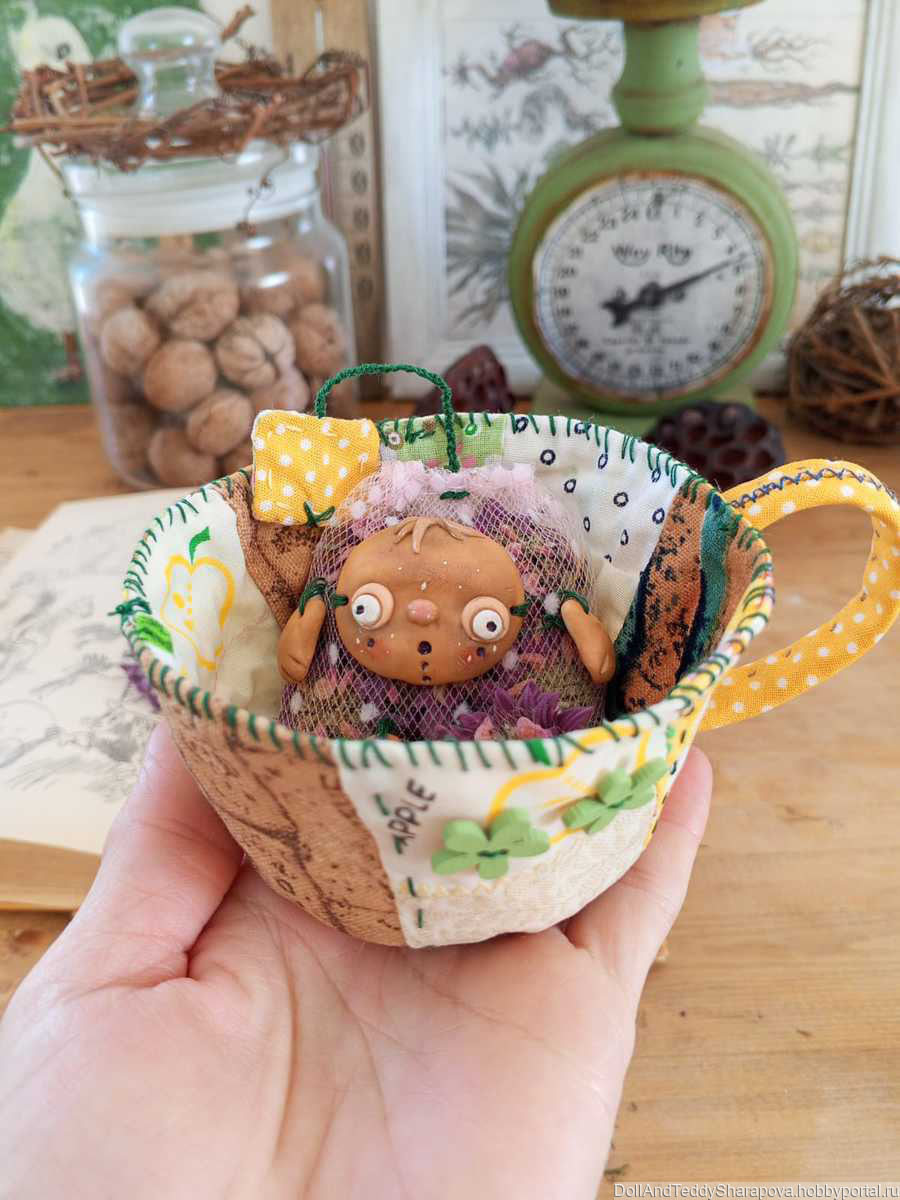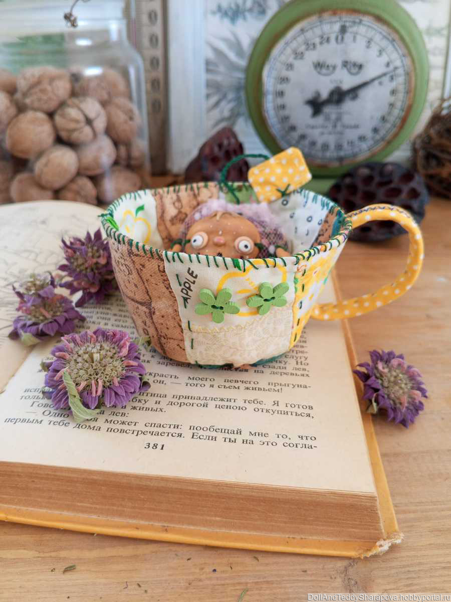 Чашка сшита в стиле пэчворк. Куколка из запекаемого пластика. Внутри пакетика монарда выращенная в моем саду на южном солнышке, пропитанная запахом моря, высушенная степным ветром. На спинке можно вынуть лепестки и заменить на свежие высушенные, если это необходимо. Такую чашку можно использовать как саше, как декор, как подарок любителю чая.
