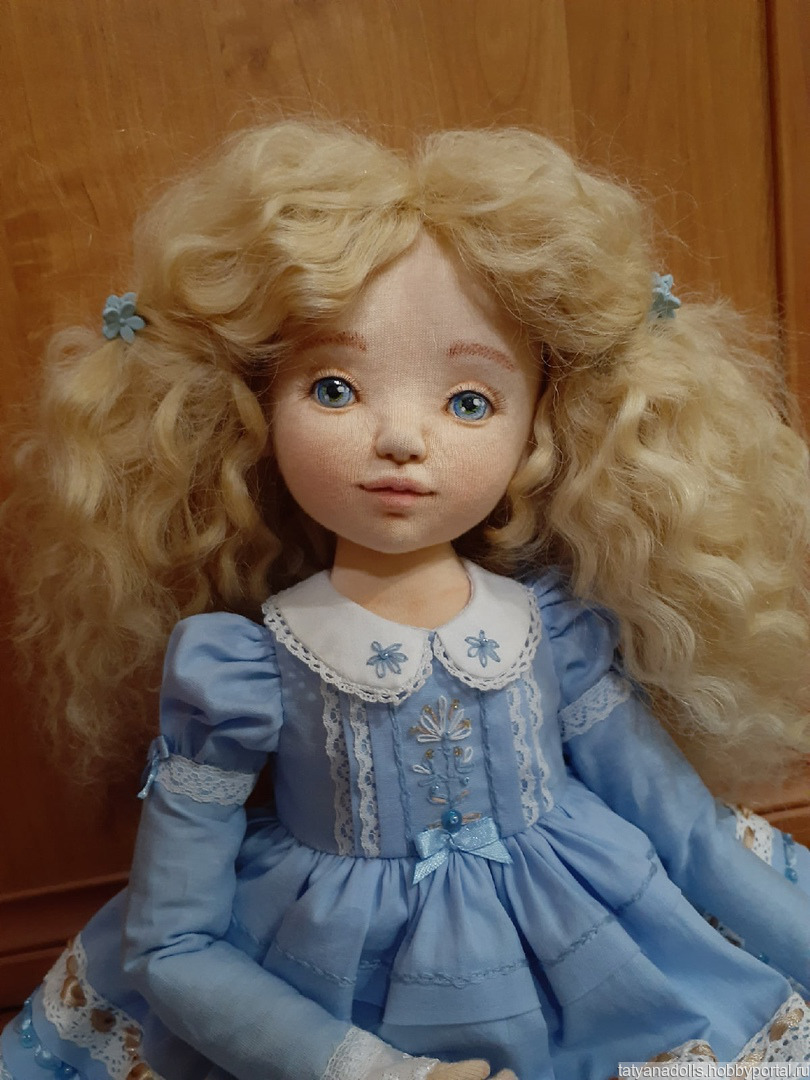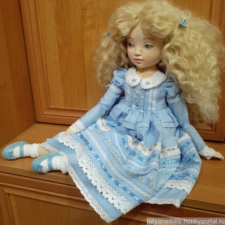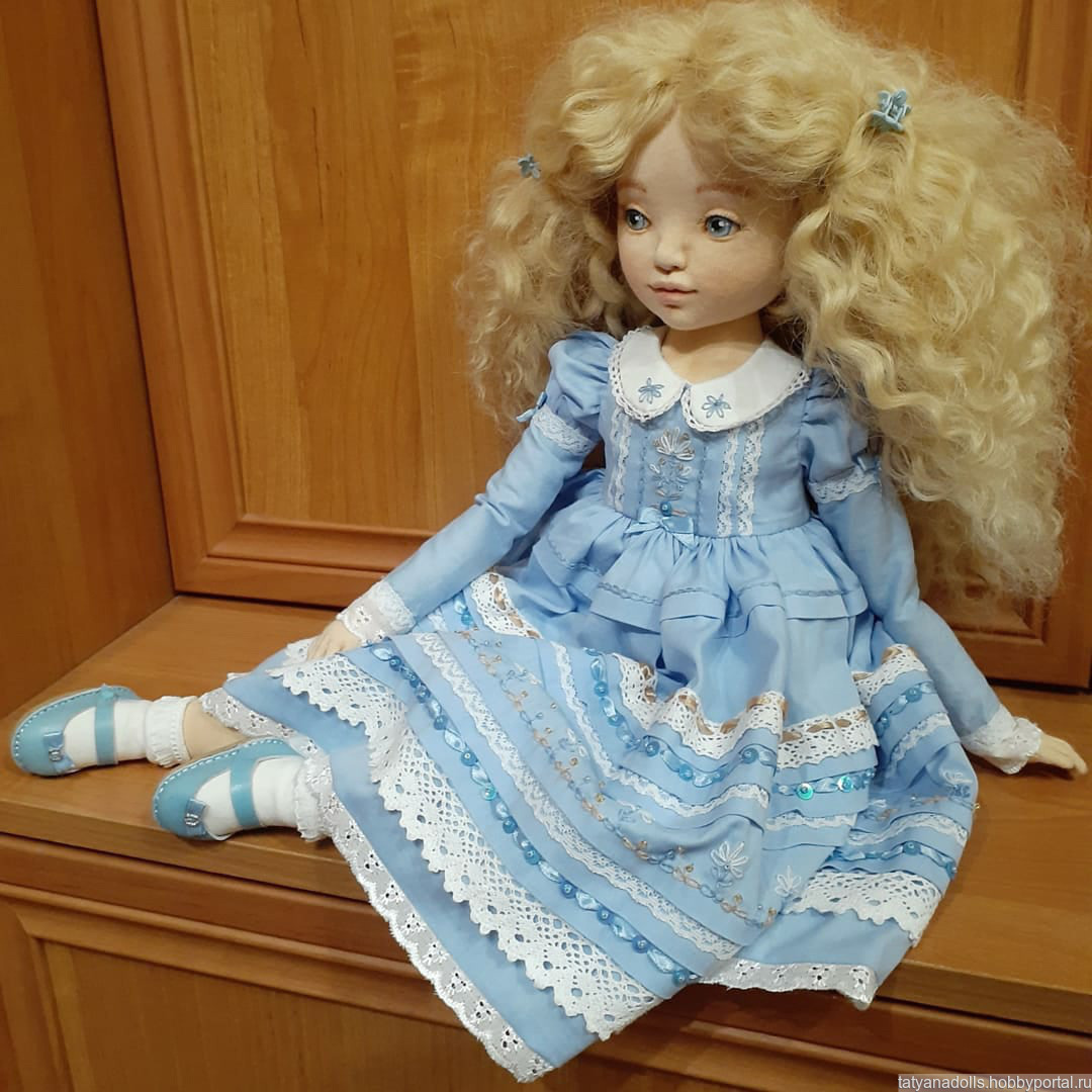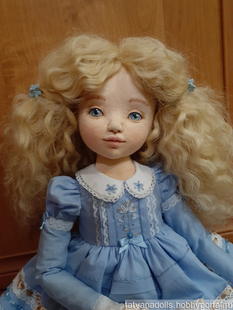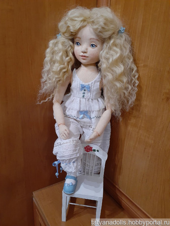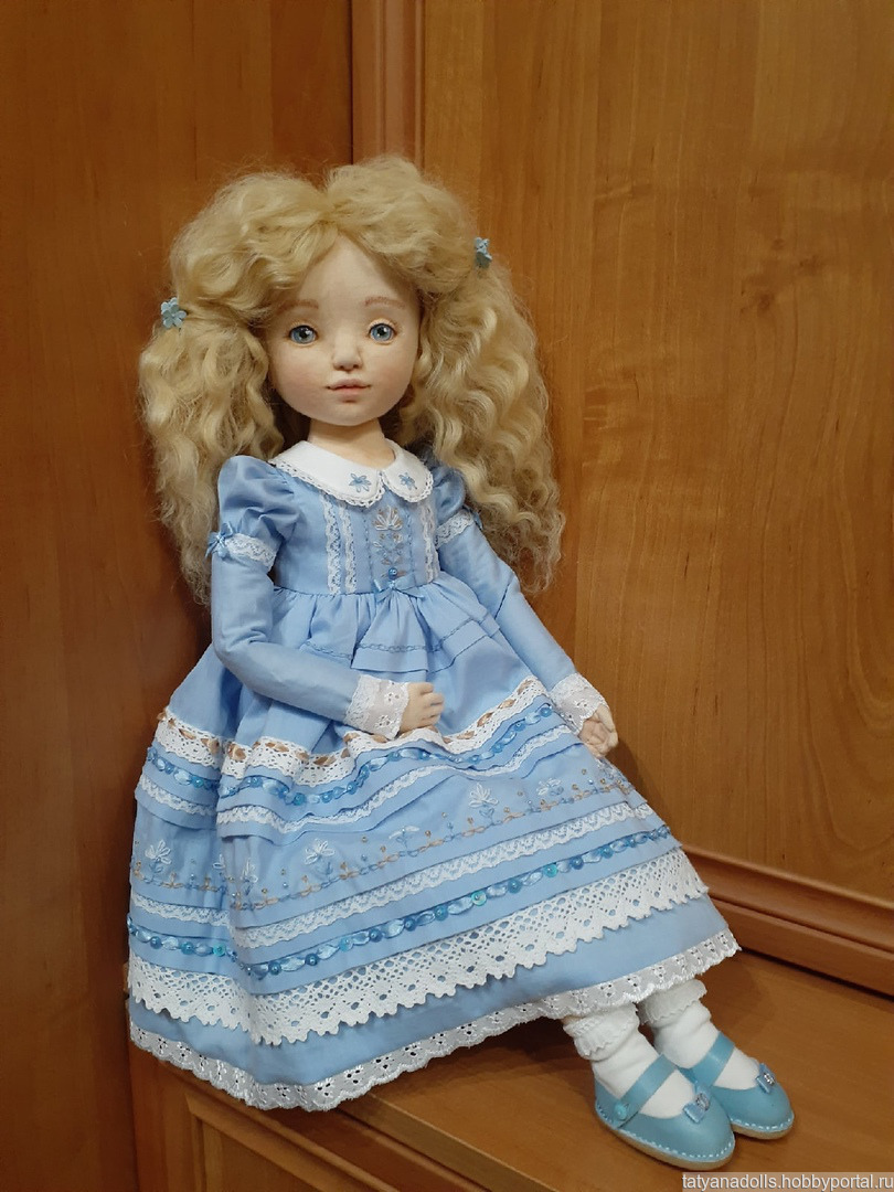 Рост 55 см. Подвижные на 12 шарнирах ручки и ножки. Стоять самостоятельно кукла не может, но хорошо сидит. Волосы - трессы из верблюжьей шерсти. Одежда вся съемная, украшена вышивкой, бисером, пайетками, кружевом и атласными ленточками. Обувь из натуральной кожи.