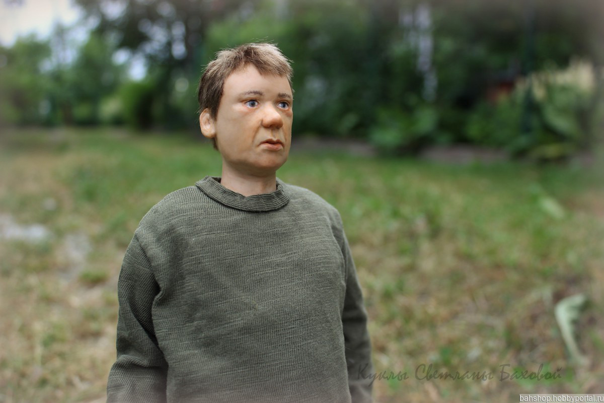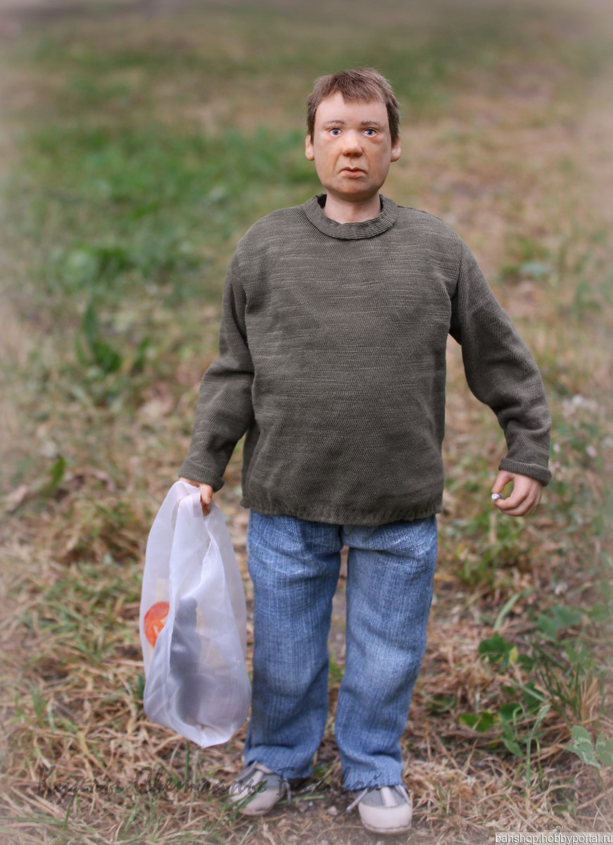 Серия " Наши люди". Кукла имеет проволочный каркас, тело и конечности из нетканого материала, голова, руки - лепка из полимерной глины Living doll, волосы - шерсть, обувь - натуральная кожа. Роспись выполнена акриловыми красками.
