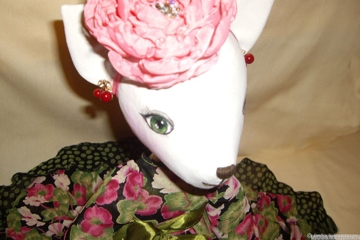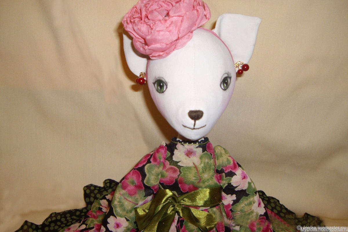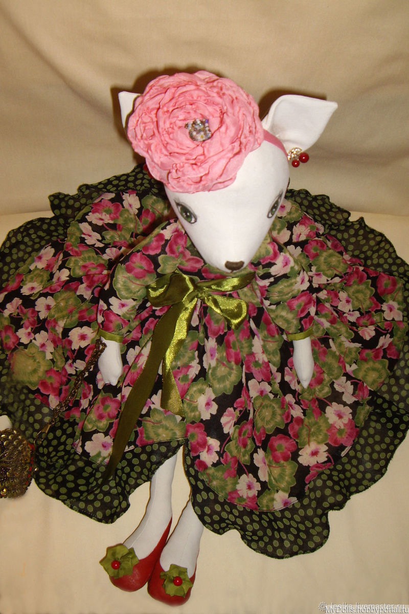 будуарная, текстильная кукла Кошечка МИЯ, тело на проволочном каркасе, платье сшито из американского крепдешина, атласная лента, цветок ручной работы, держит бискорню, расшитое с лицевой стороны японскими пайетками и бисером. С обратной стороны вышит славянский оберег символизирующий счастье. Лицо расписано вручную. В ушках сережки в виде вишенок. Нижнее белье - комбинезон из х/б ткани. Очень приятно держать в руках, кукла умеет только сидеть разложив широкий подол платья по кругу. Украсит своим видом любую комнату девочки, девушки, женщины.