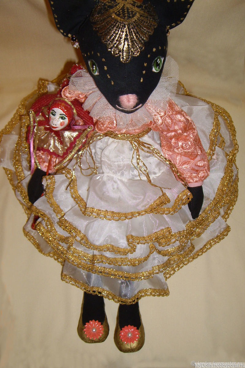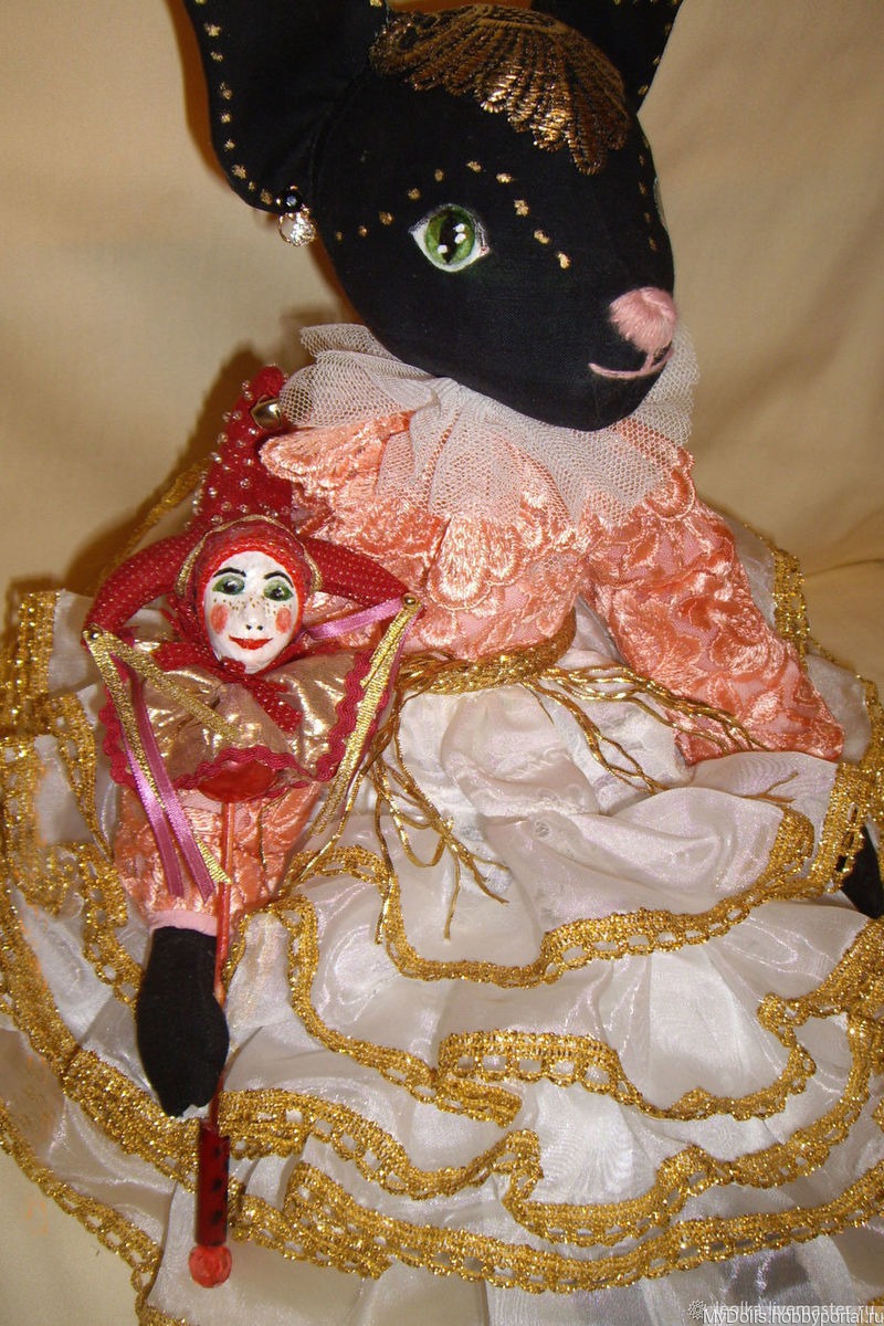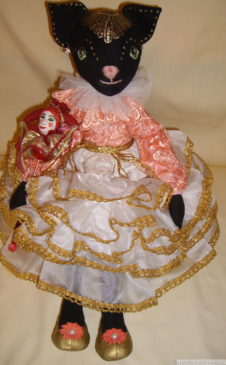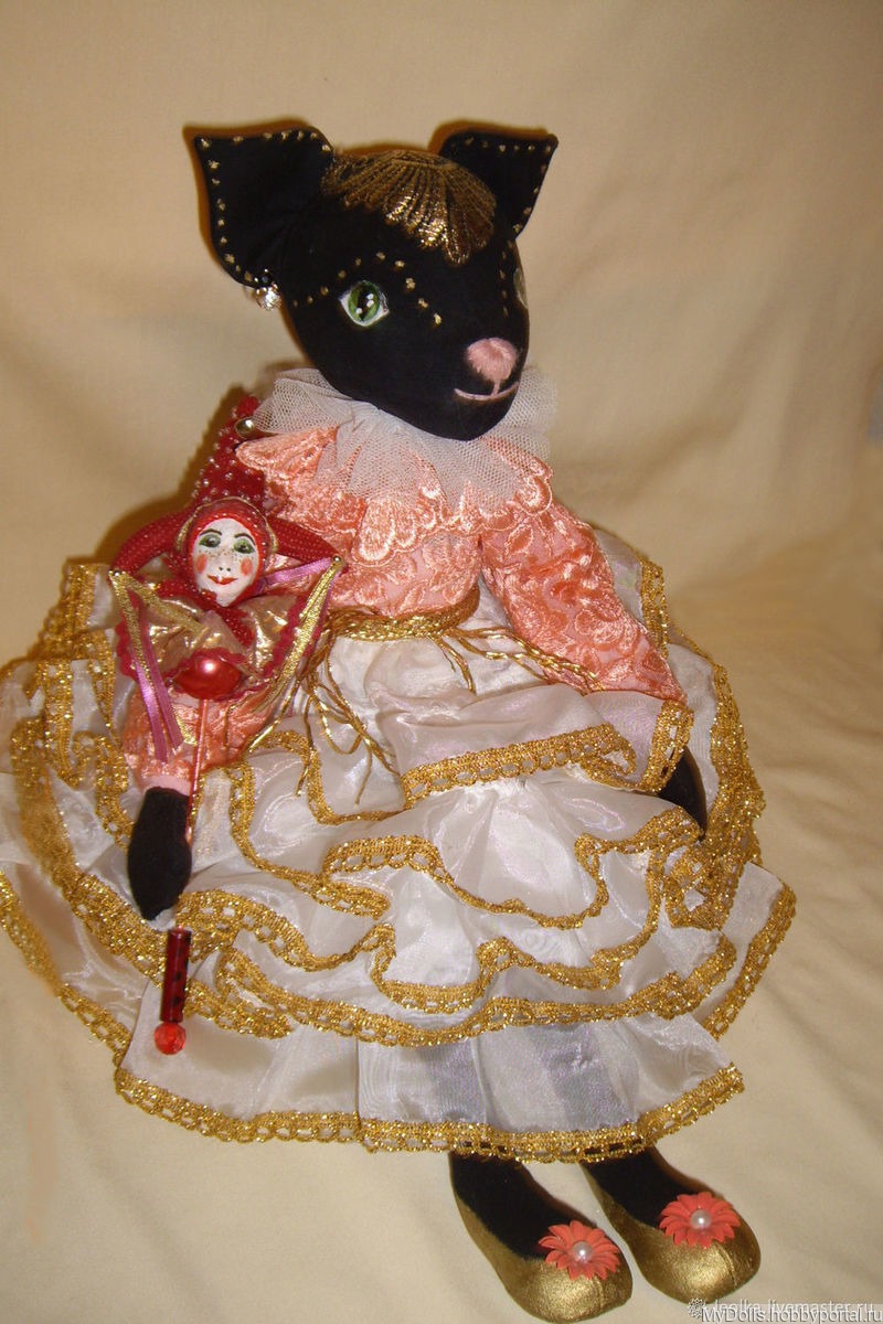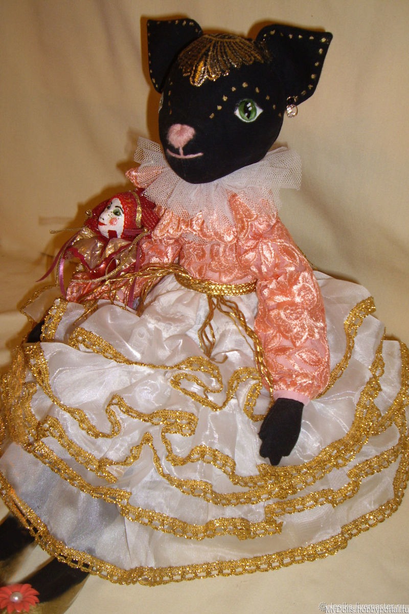 будуарная, текстильная кукла Кошечка НАОМИ, тело на проволочном каркасе, нарядное платье украшено золотистой тесьмой. В ручке держит Маротти. Эта странная игрушка была постоянной компанией для дам высшего общества XIX века в бальные сезоны. Их держали в руках и прибегали к их помощи тогда, когда представительница прекрасного пола хотела привлечь внимание кавалера. Легким движением руки игрушка раскручивалась вокруг своей оси и приводила в движение маленькие колокольчики, которые своим мелодичным звоном и привлекали внимание кавалеров... Лицо расписано вручную. В ушках сережки в виде маленькой черной кошечки. Нижнее белье - комбинезон из х/б