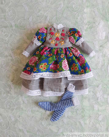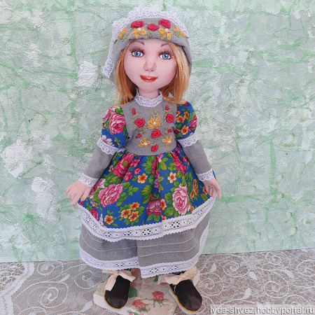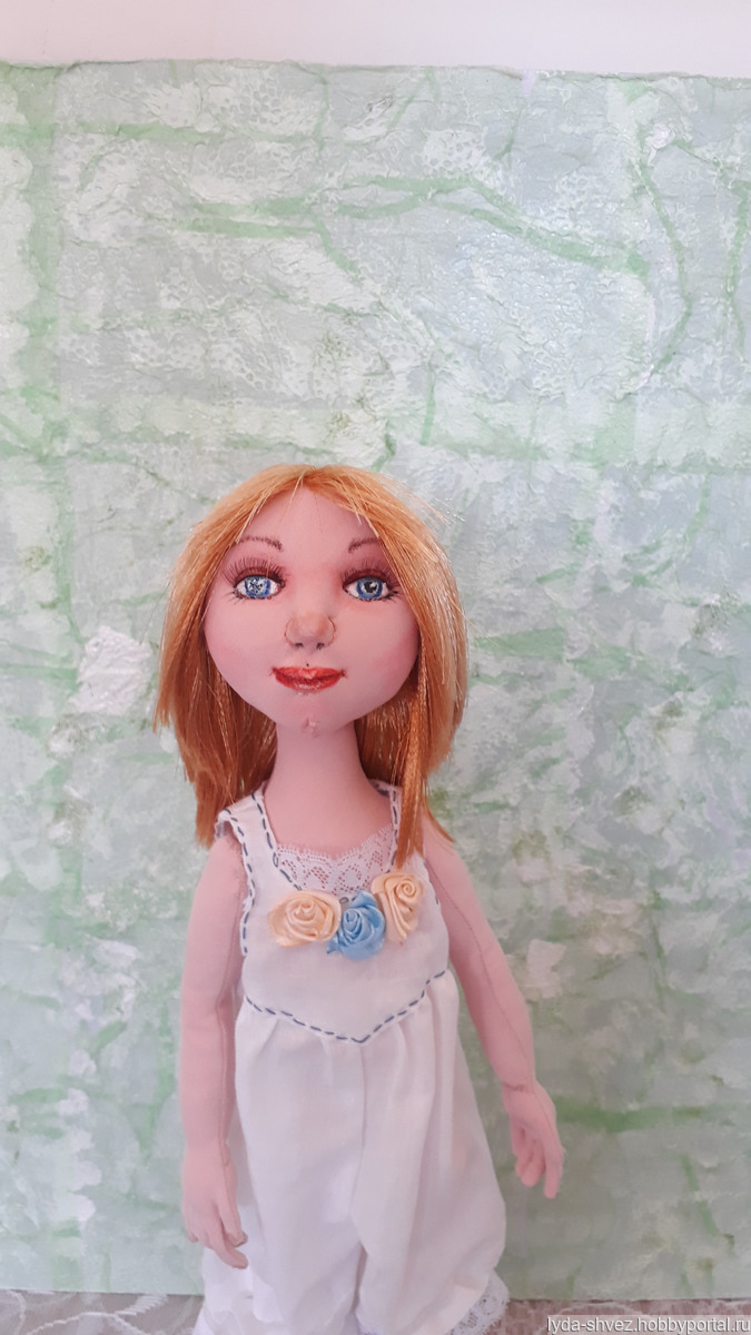 Текстильная кукла ручной работы. Создана для украшения интерьера, но можно играть детям. Одежда вся снимается, ручки и ножки подвижные. Кукла стоит на подставке, но может сидеть, менять позы.