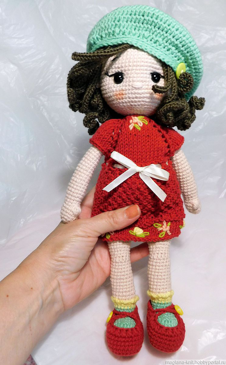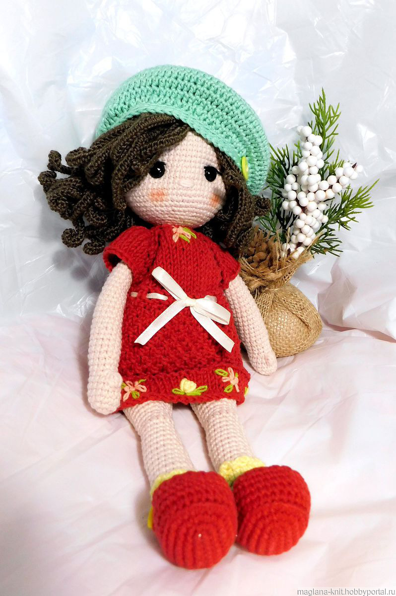 Кукла Эмма связана из полухлопковой пряжи и заполнена гипоаллергенным наполнителем. Представлена с комплектом одежды.