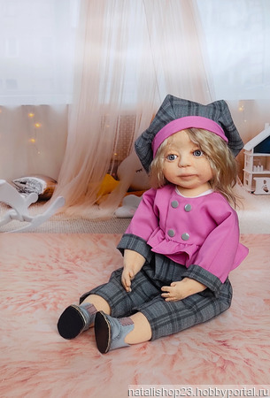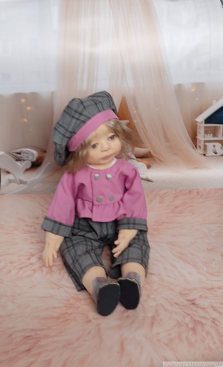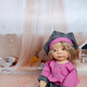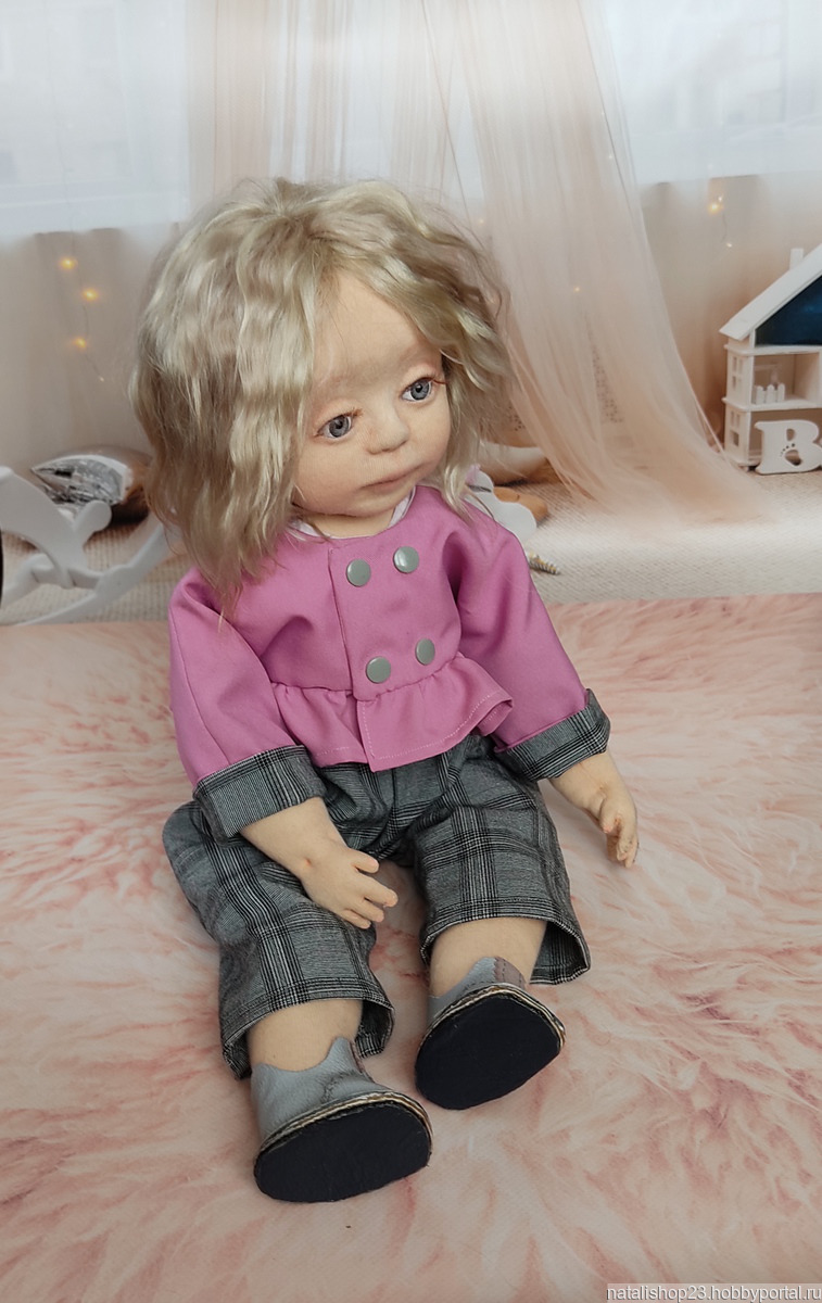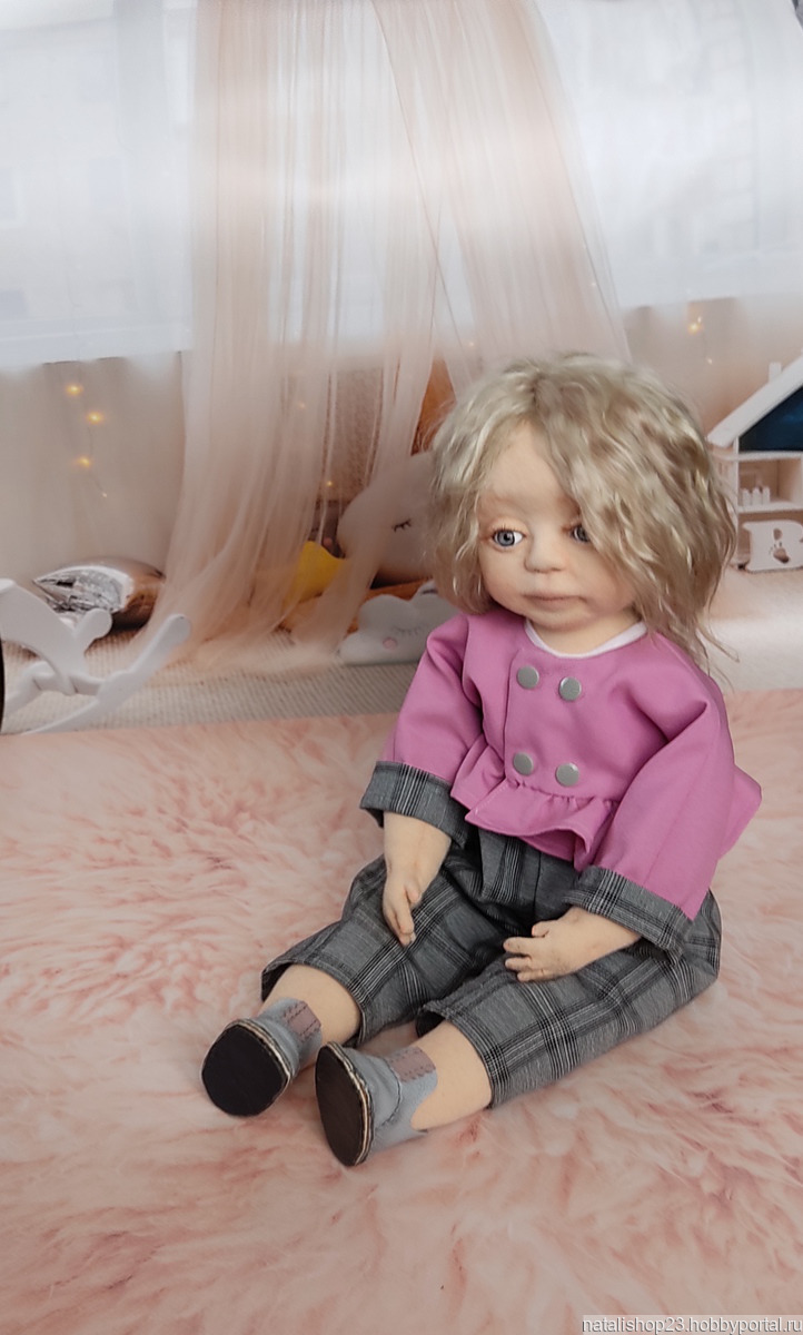 Кукла выполнена в технике скульптурный текстиль. Кукла-болтушка, т. е. мягкое соединение рук и ног, что позволяет красиво усадить её. Наполнить -синтепон. Кукла может красиво сидеть, принимать различные позы, но стоит только на подставке. Одежда съёмная.имеется нижнее бельё и костюм. Волосы можно аккуратно расчёсывать, делать причёски, они натуральные из шерсти козы. Кукла для больших девочек или для украшения интерьеров.