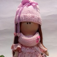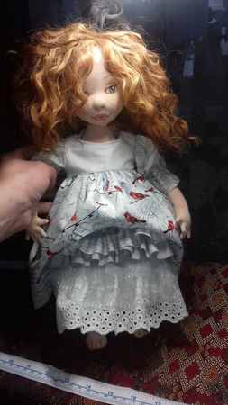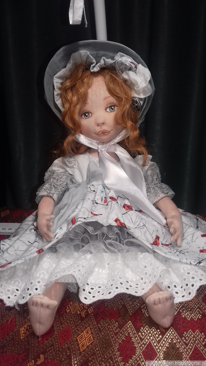 Это милое создание приятно брать на руки. Она излучает тепло. Лицо куколки скульптурное и обтянуто трикотажем. Кукла одета в оригинальное платье, нижнее кружевное белье и капор. На ногах носочки и туфельки. В руках Агаты снегирь.