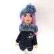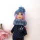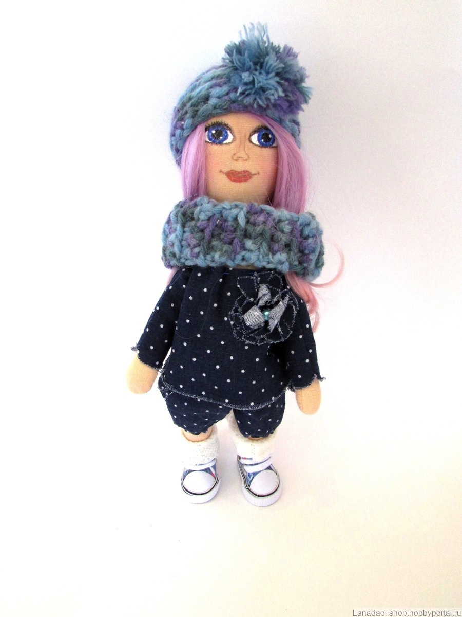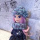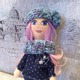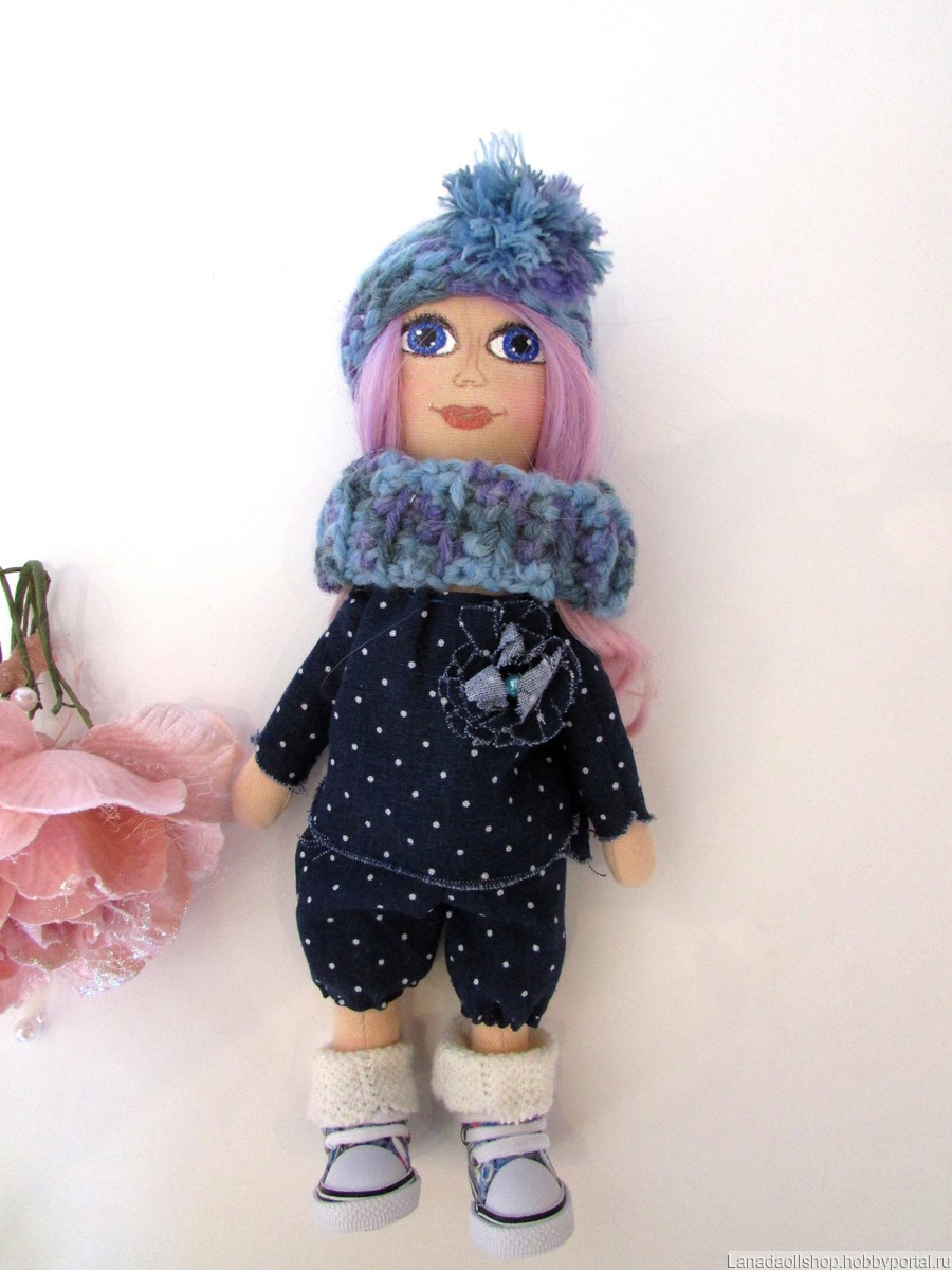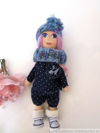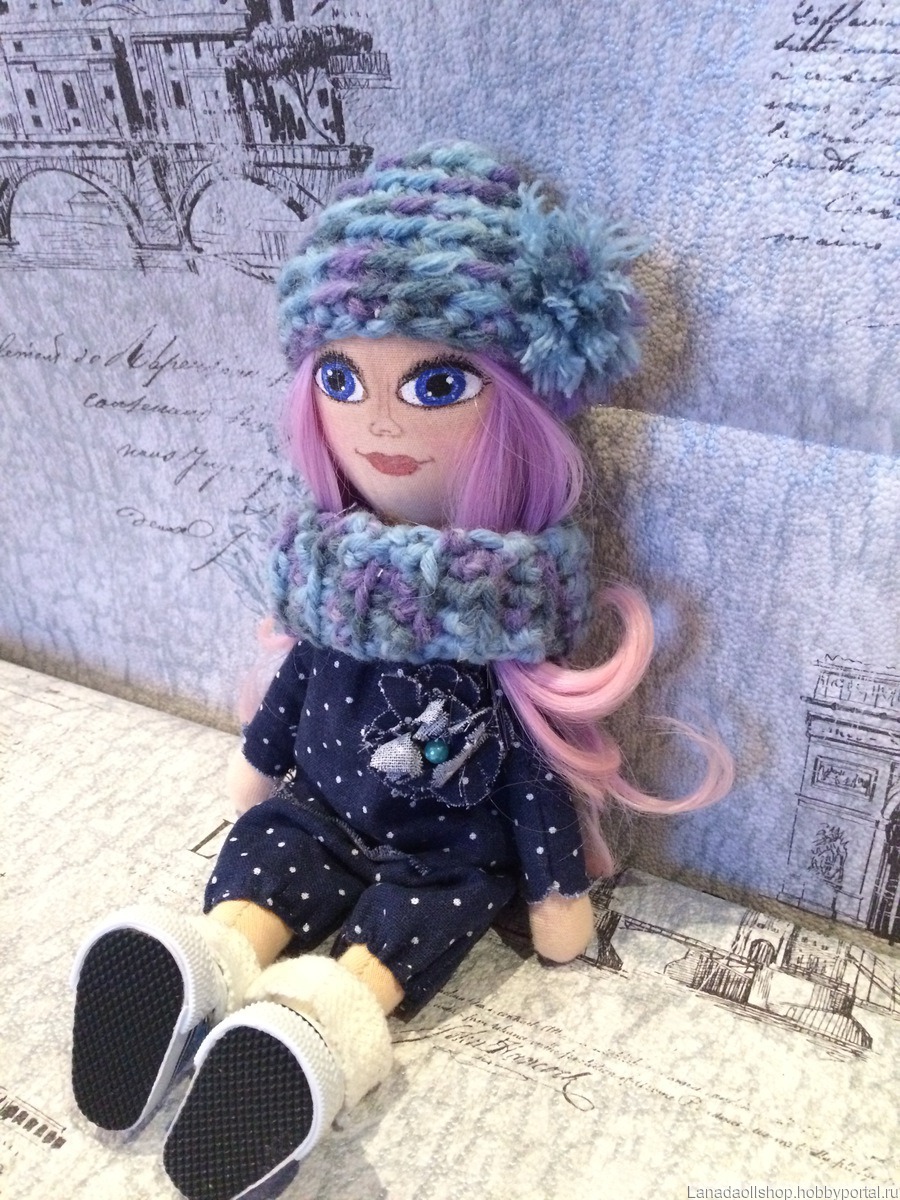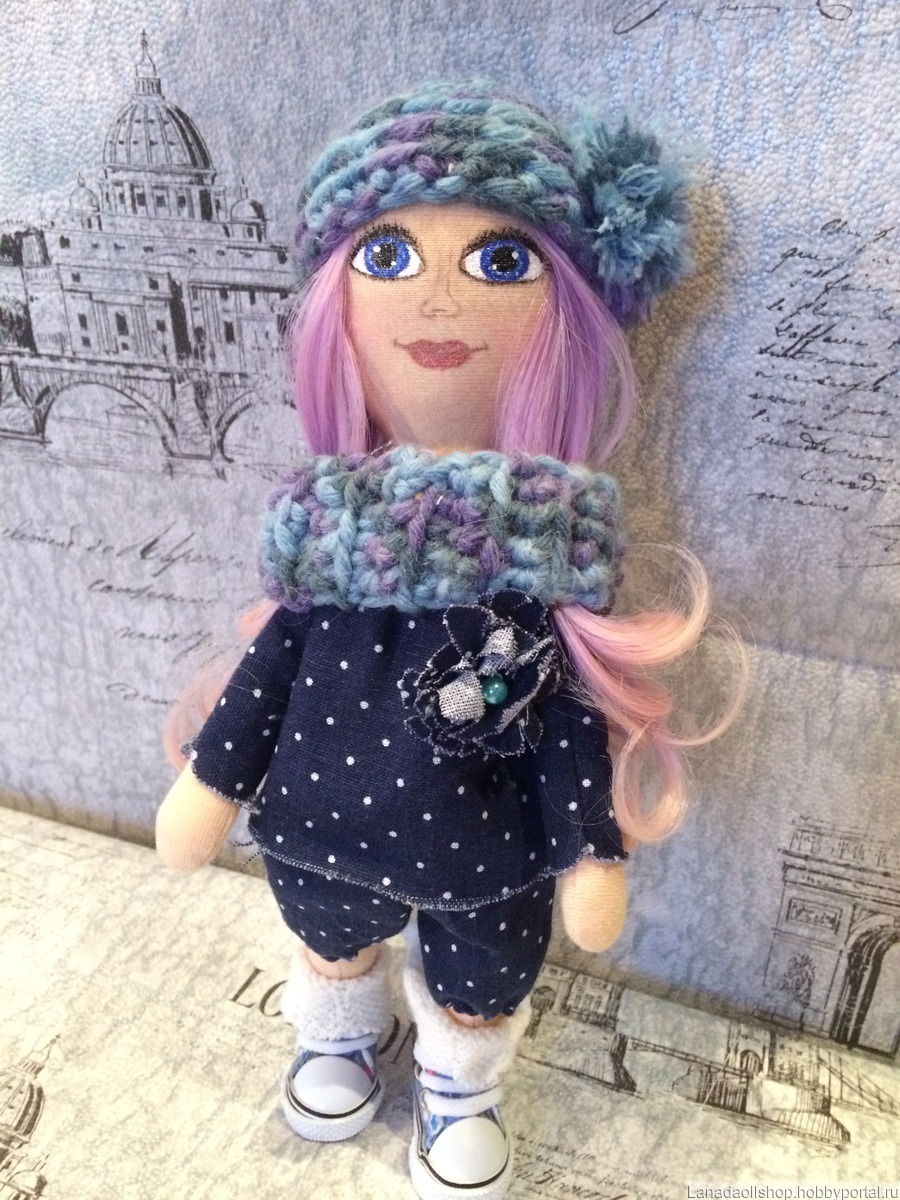 Куколка с сиреневыми волосами и синими глазами, сшита из трикотажа, наполнена синтепоном, душой мастера. Стоять умеет самостоятельно. Одежда не снимается, кроме шапочки. Можно аккуратно расчесывать. Ручки, ножки подвижны.