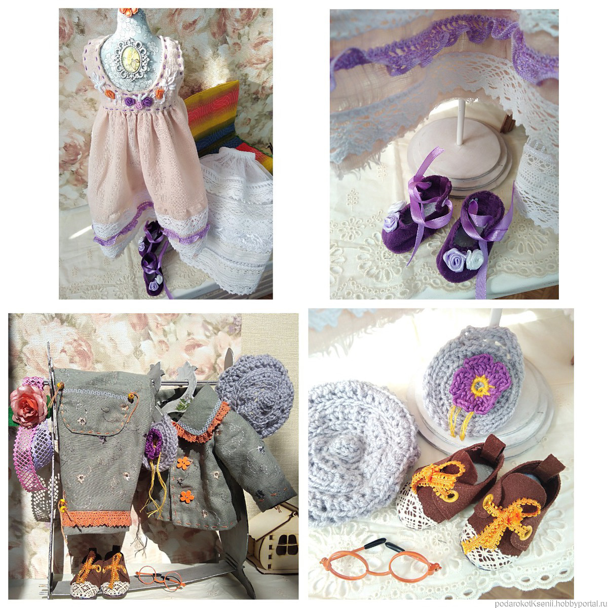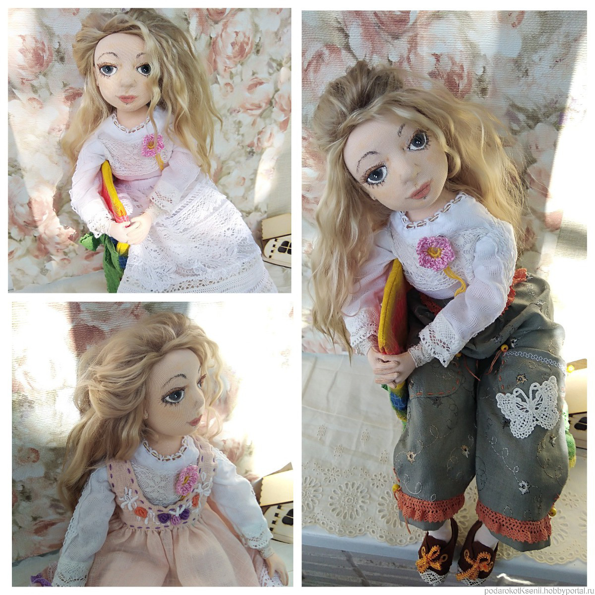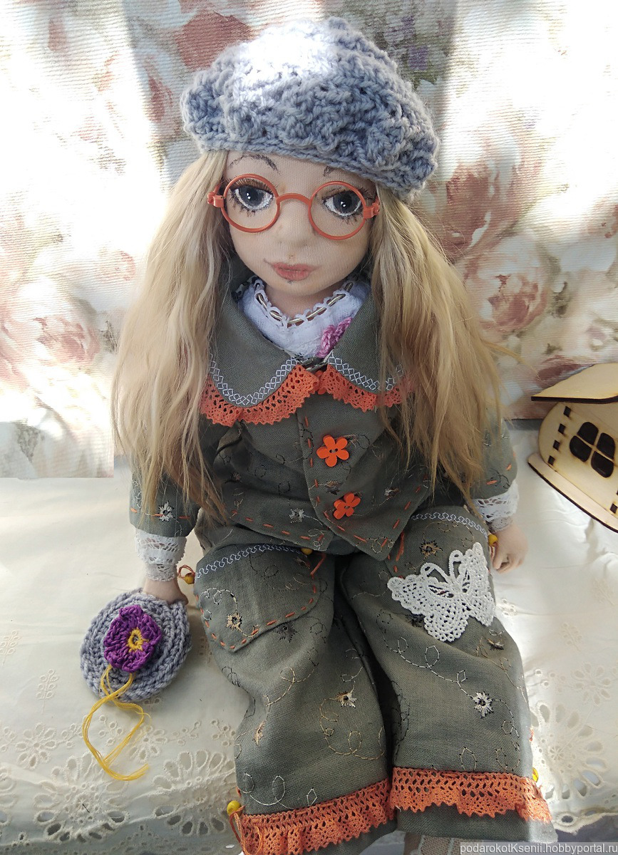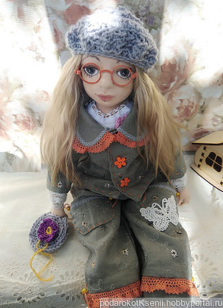 Вся одежда и обувь сшиты вручную из натуральных материалов. У Мари три комплекта одежды - нижний комбинезончик и чулочки; нарядное платье-сарафан и балеточки на завязках; а также брючный костюмчик из льна, кожаные туфельки, вязаные берет и сумочка. Вся одежда снимается.