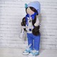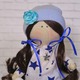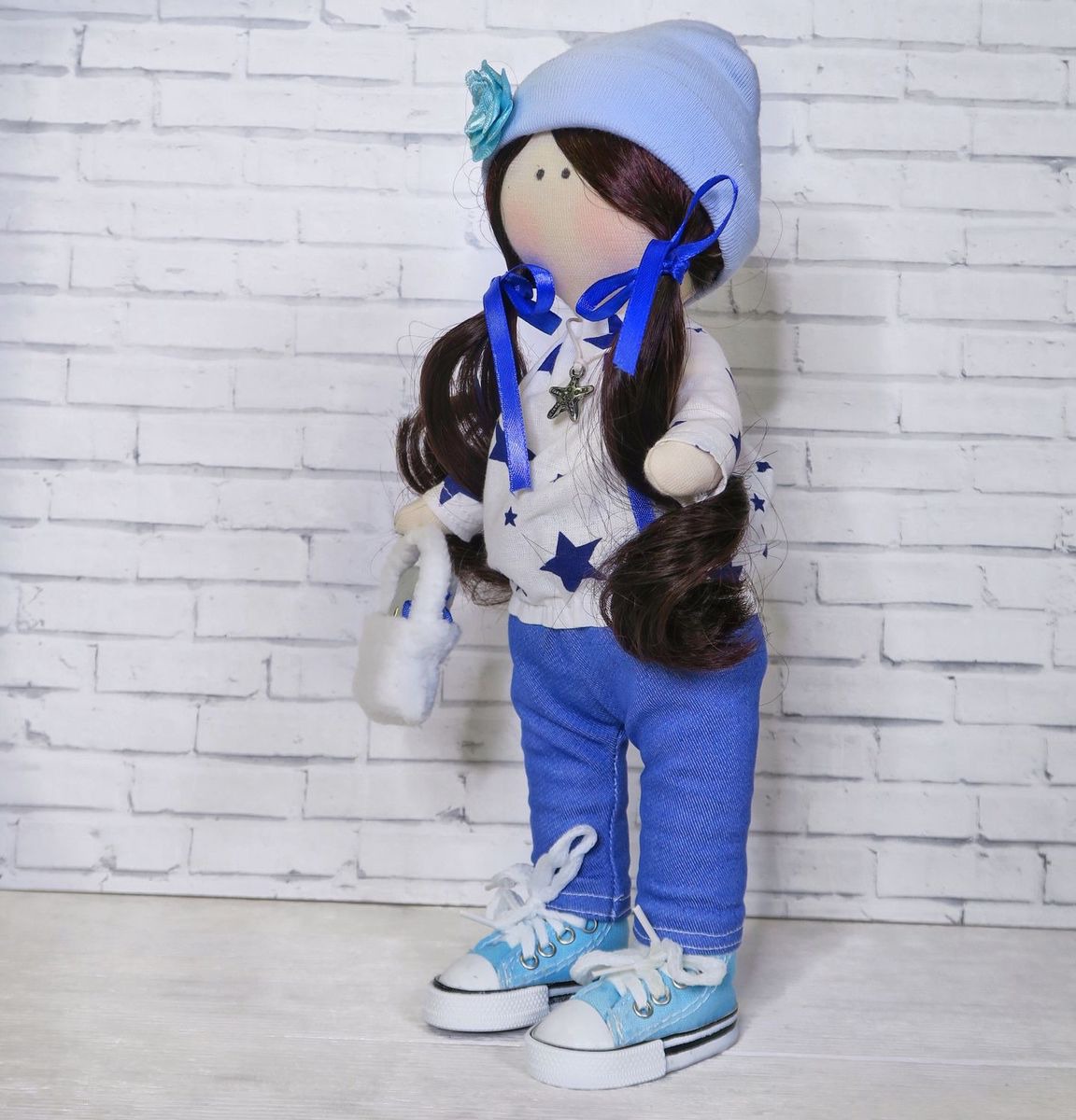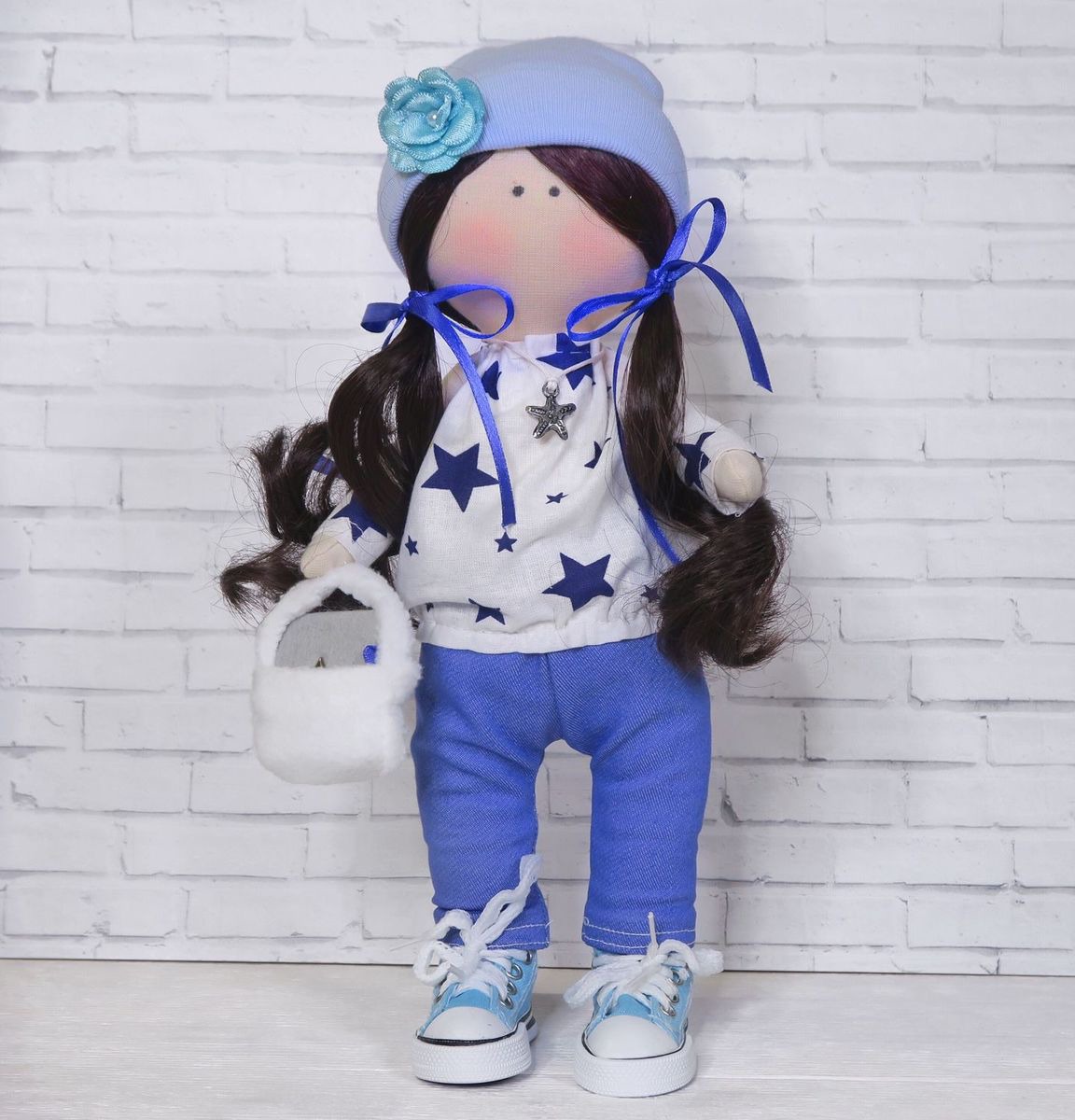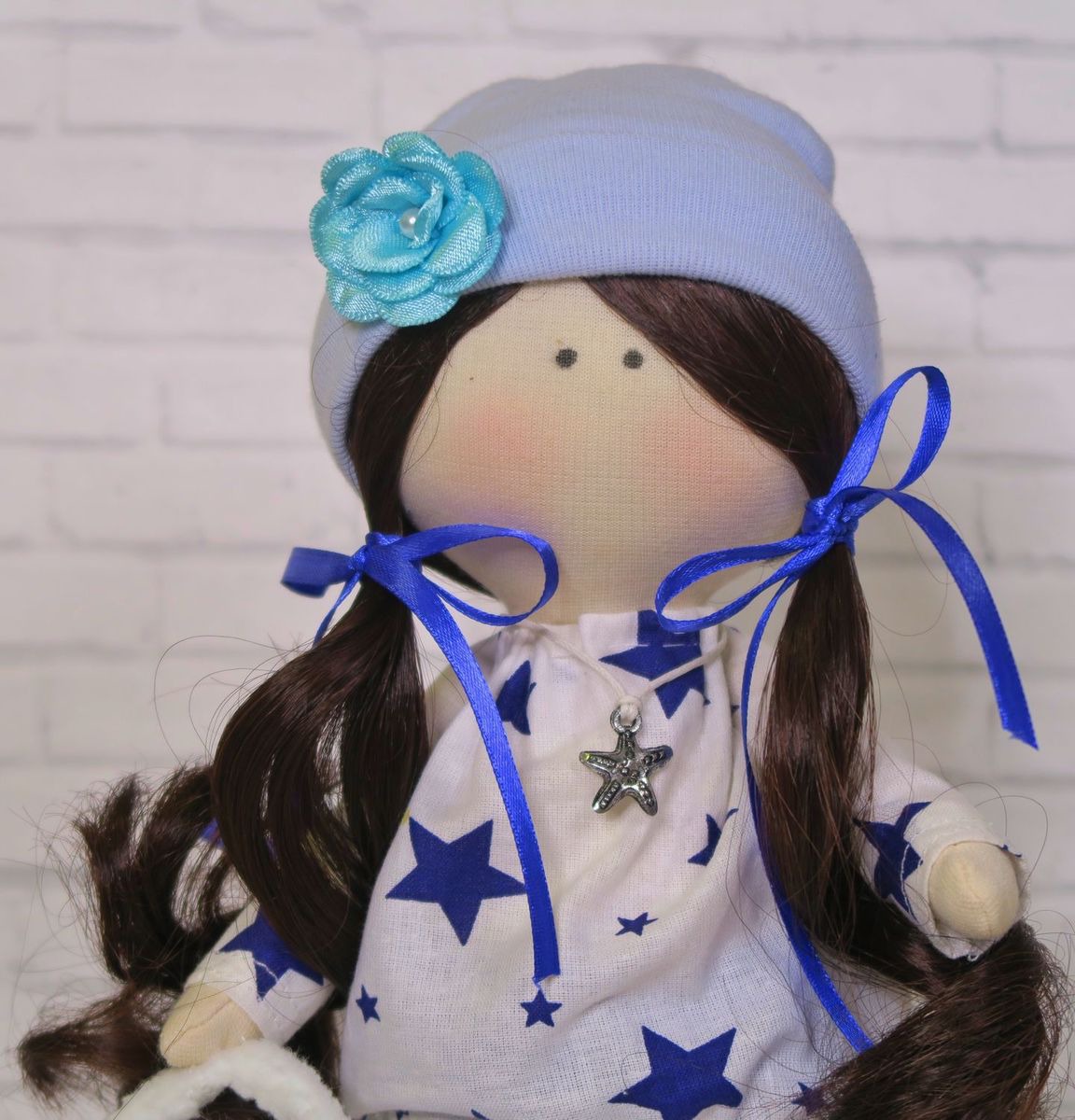 Кукла в "звездной" кофточке и джинсах. Одежда и шапочка не снимаются. Стоит самостоятельно, без опоры. В приятной сине-белой гамме прекрасно впишется в любой интерьер. В руке куклы - белая сумочка из флиса, внутри - книга со звездочкой на обложке.