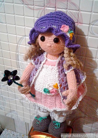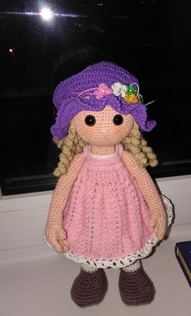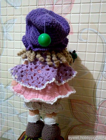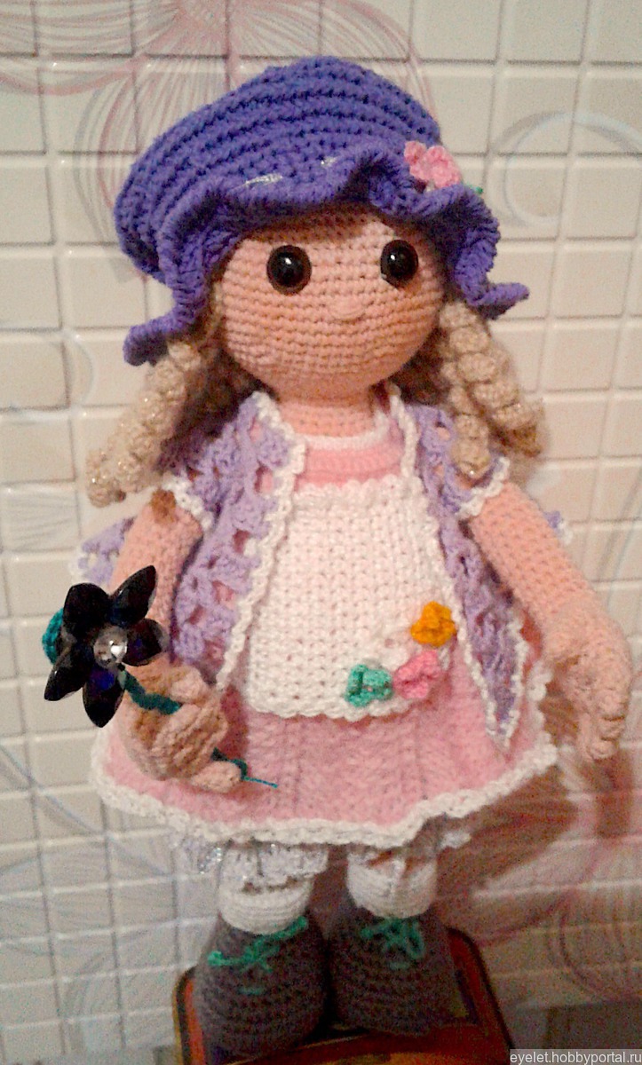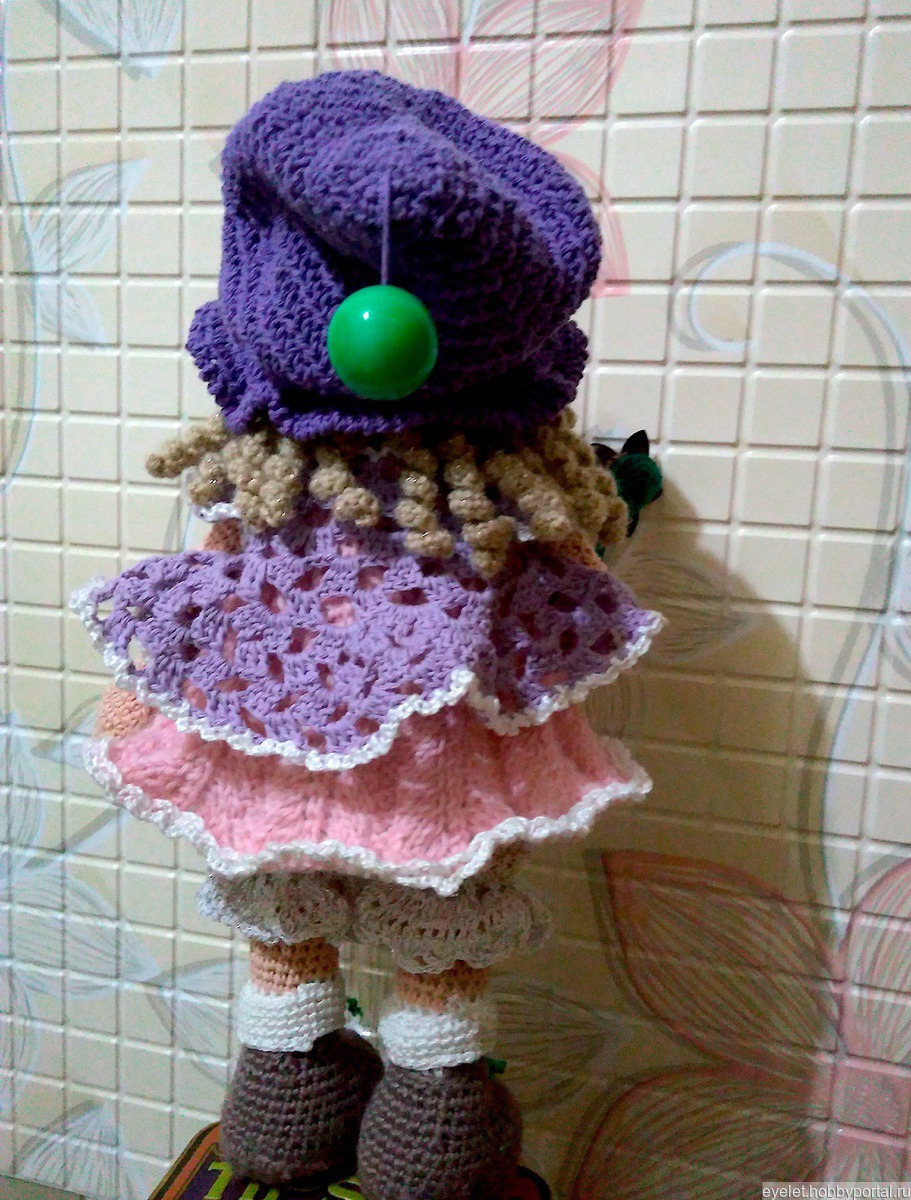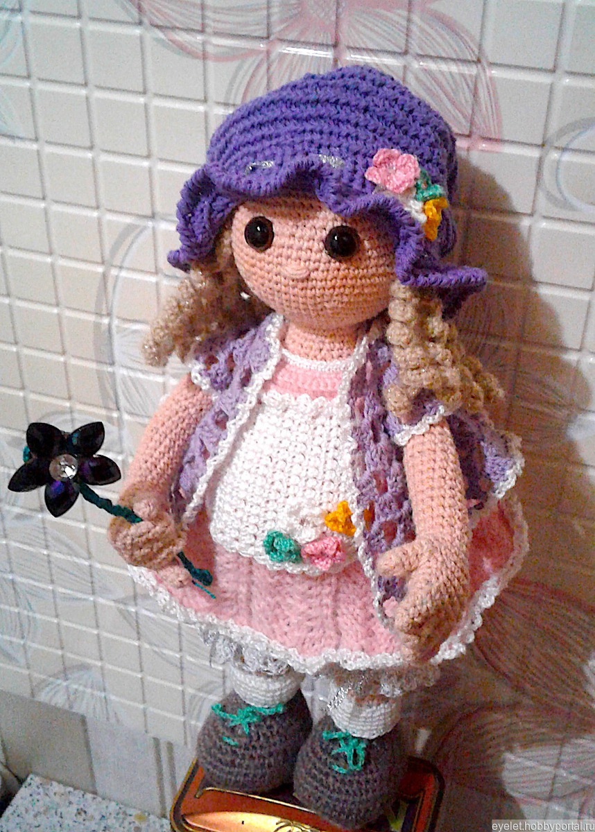 Куколка выполнена крючком из х/б пряжи, платье и ботиночки акрил. Высота 25 см. На каркасе, может стоять и сидеть.