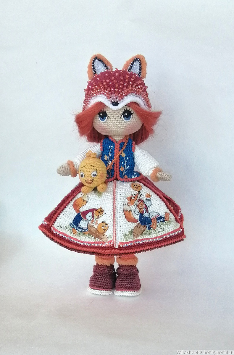 Интерьерная кукла, связана из хлопка и украшена вышивкой по вязанному полотну. Стоит уверенно. Одежда не снимается. Рост 34см