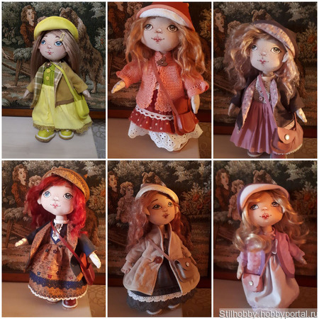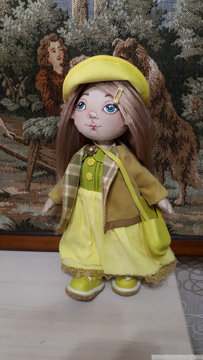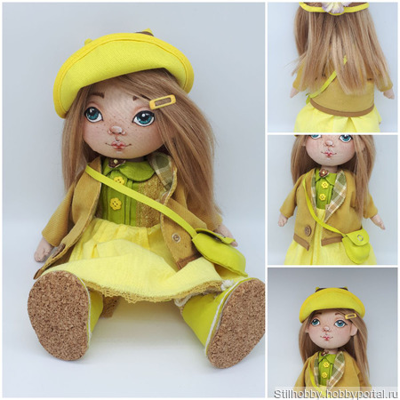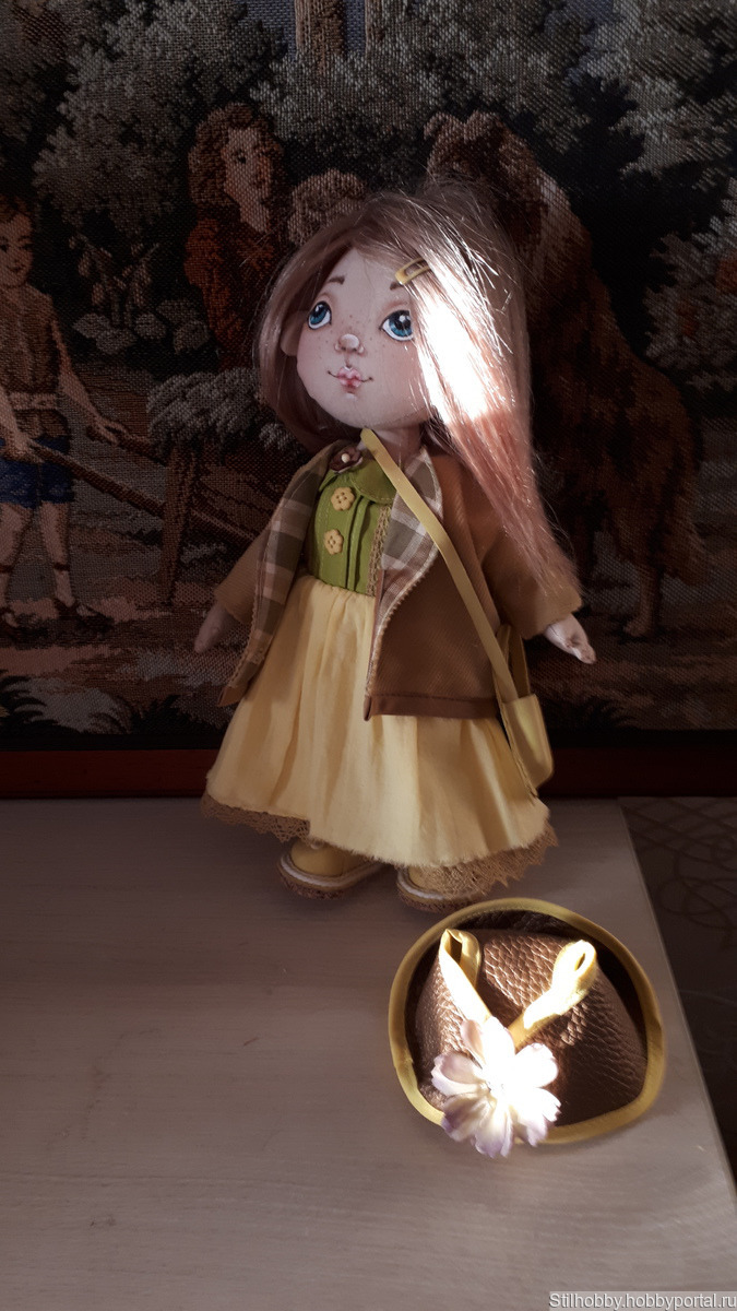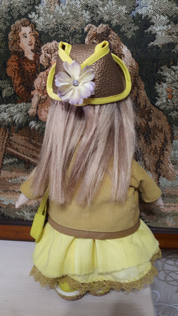Текстильная кукла сшита из корейского хлопка,лицо нарисовпно красками доя ткани,волосы из натуральнвых козьих тресс надежно приклеены и их можно расчесывать.Ручки и ножки на шарнирах.Куколка имеет полный гардероб,который можно снимать:белье,носочк,платье,пальто,панамка.Сумочка и обувь выполнены из натуральной кожи.