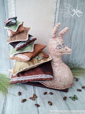 Интерьерная, декоративная улитка ручной работы. Сшита из хлопка, на подставке, глазки и тельце расписаны акриловыми красками и пастельными карандашами. Все закреплено лаком «Фиксатив». Подушечки выполнены из портьерной ткани, украшены кружевом и деревянными бабочками.
