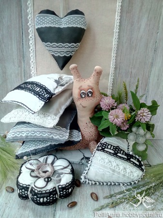 4 подушечки и улитка – одно целое, прилагается игольница и два сердечка.