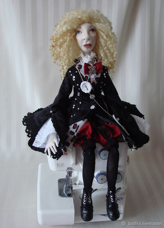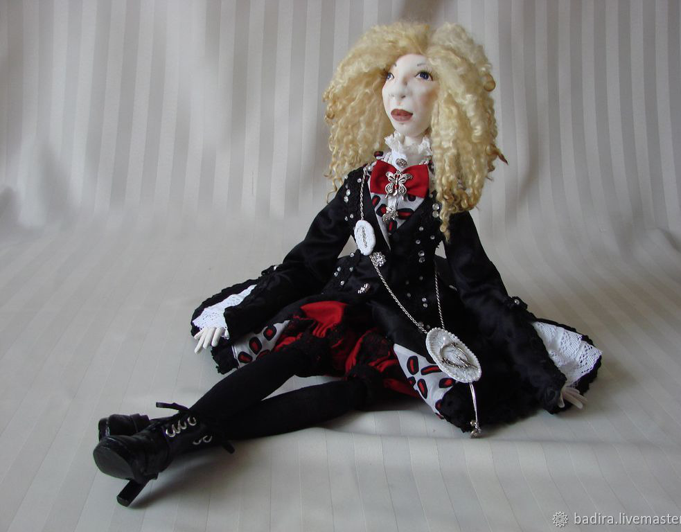 Тёплая, мягонькая.... Крепления ниточные. Голова свалена из овечьей шерсти, обтянута трикотажем. Кисти рук на проволочном каркасе. Волосы - овечьи кудри породы Венслидейл.