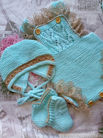 Очень нарядный ромпер, чепчик и пинетки подойдут как для торжества, так и для фотосессий. Связан из хлопок/акрил До 3-5 месяцев