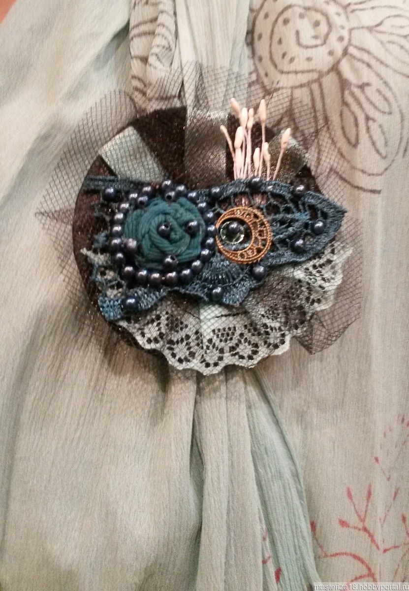 Текстильная брошь размером в диаметре 7 см для фиксирования палантинов, шарфов, а также будет прекрасно смотреться на трикотаже, коже, куртке или пальто. Цвет бирюзовый