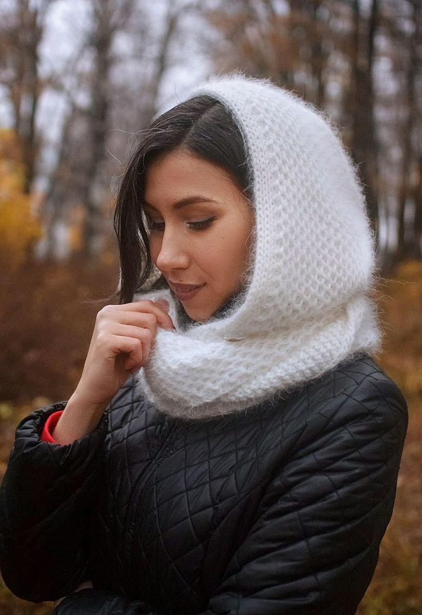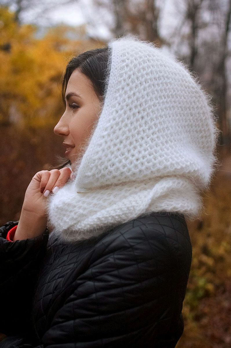 Капюшона со снудом "Соты" связан на спицах из пряжи Норка в составе которой 75% пух ангорского кролика.