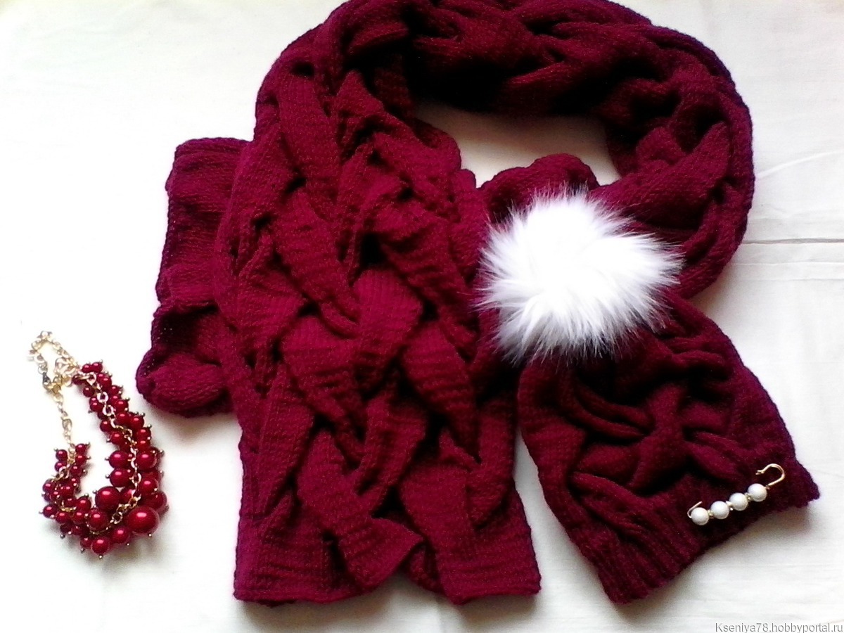 Теплый, уютный комплект из полушерсти. Помпон на шапочке съемный. Шапочку украшает брошь. Комплект в наличии. Отправка по всему миру. Цвет спелой вишни.Принимаю заказы. Повтор в любом цвете.