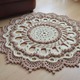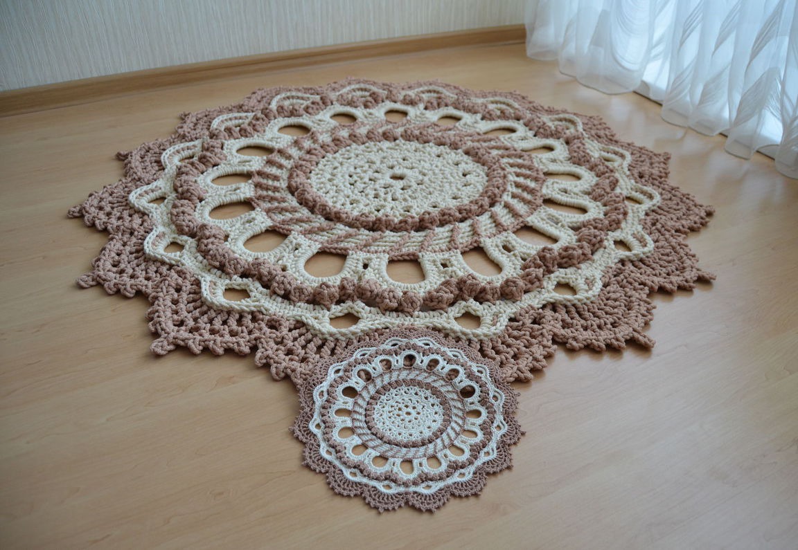 Представляю вашему вниманию комплект для дома: вязаный ковер ручной работы, выполнен крючком из полиэфирного шнура с сердечником. Диаметр ковра 120 см. Цвет: молочный-светлый беж. Плюс мини-копия ковра - салфетка диаметром около 30 см, выполнена из хлопковой пряжи в одной цветовой гамме с ковром. Получается настоящий FAMILY LOOK для вашей квартиры)))