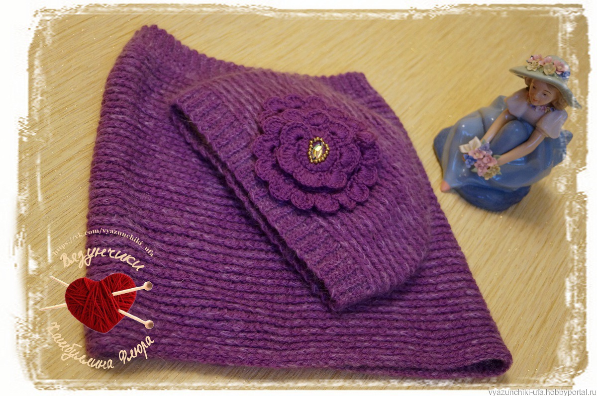 комплект "Глоксиния". Это теплая шапка с большим объемным цветком, напоминающим цветок глоксинии, и снуд-трубы, связанные крючком из мягкой полушерстяной пряжи с добавлением нитки кидмохера. И шапка, и снуд связаны по кругу без швов. Шапочка имеет подкладку из теплого полартека, что обеспечивает надежную защиту от ветра и мороза.