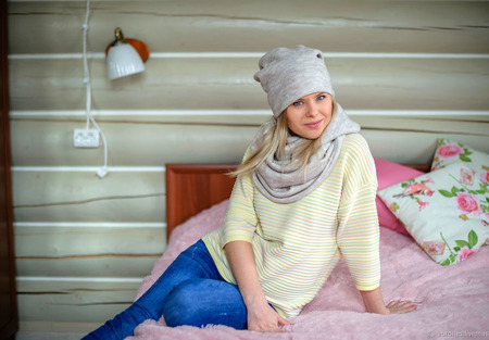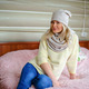 Комплект сшит из очень мягкого вязанного трикотажа. Вязаный трикотаж – смесовый: в полотне сочетаются волокна полиэстера, шерсти и мохера. Благодаря искусственным добавкам готовая вещь лучше сохраняет форму, проще разглаживается. Подклад у шапочки вискоза с хлопком.