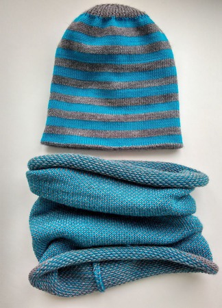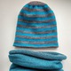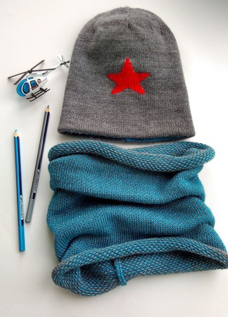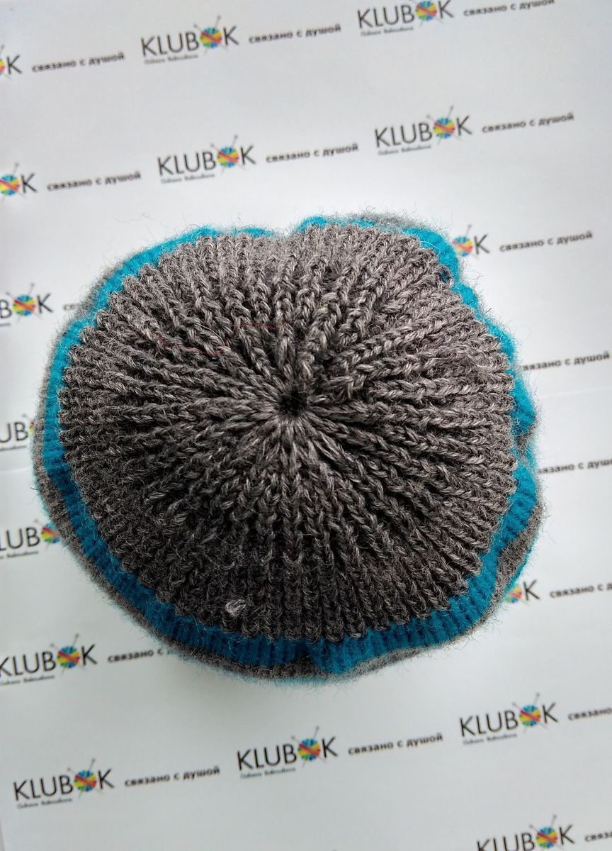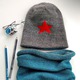 Двусторонняя шапочка: с вышивкой алой звезды на сером фоне и серо-голубую полоску изнутри (или снаружи!). Длина 22 см, на обхват головы 50-52 см.