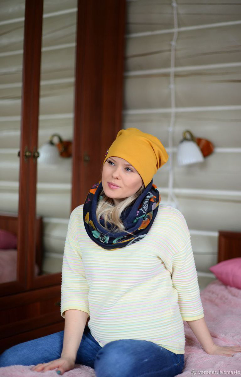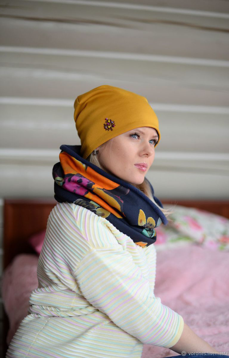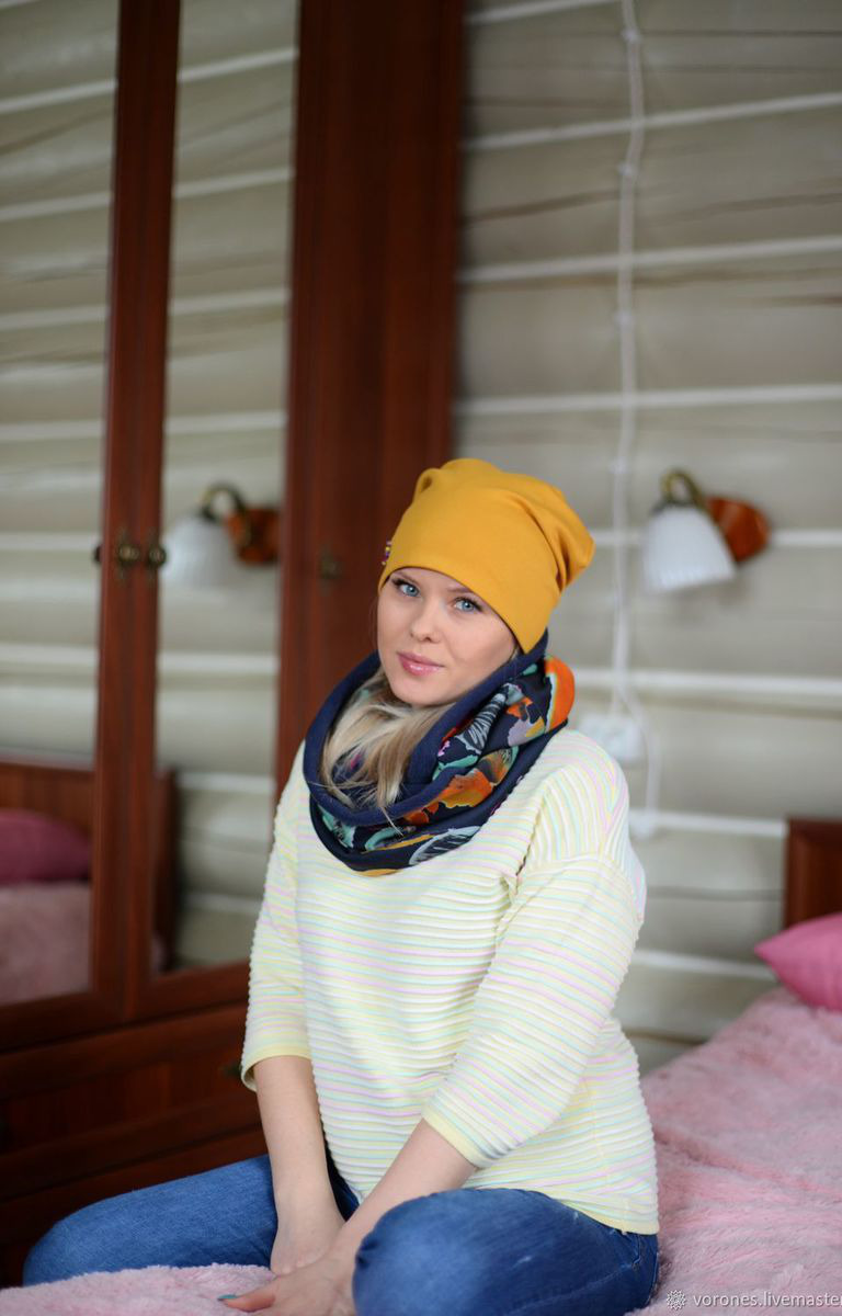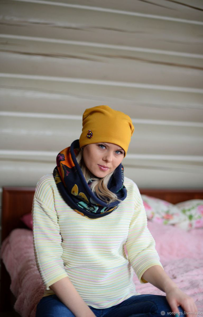 Комплект шила из очень мягкого и приятного на ощупь трикотажного полотна. Цвет модный и очень забавный. Снуд в два оборота. Шапка бини на трикотажной подкладке джерси.