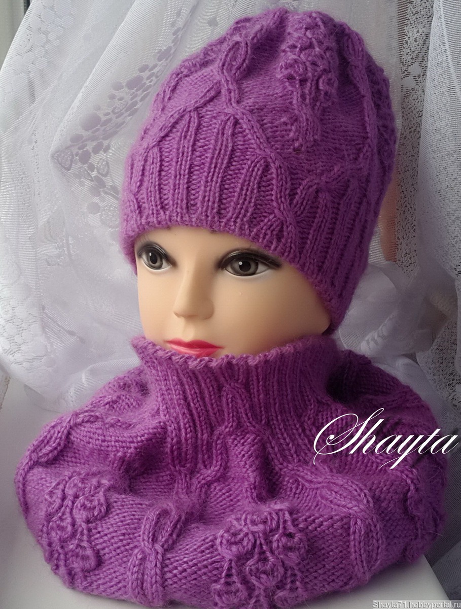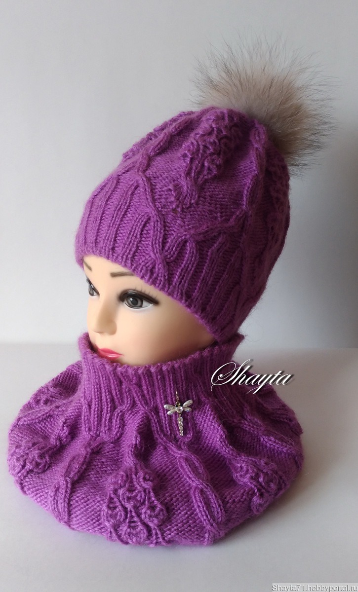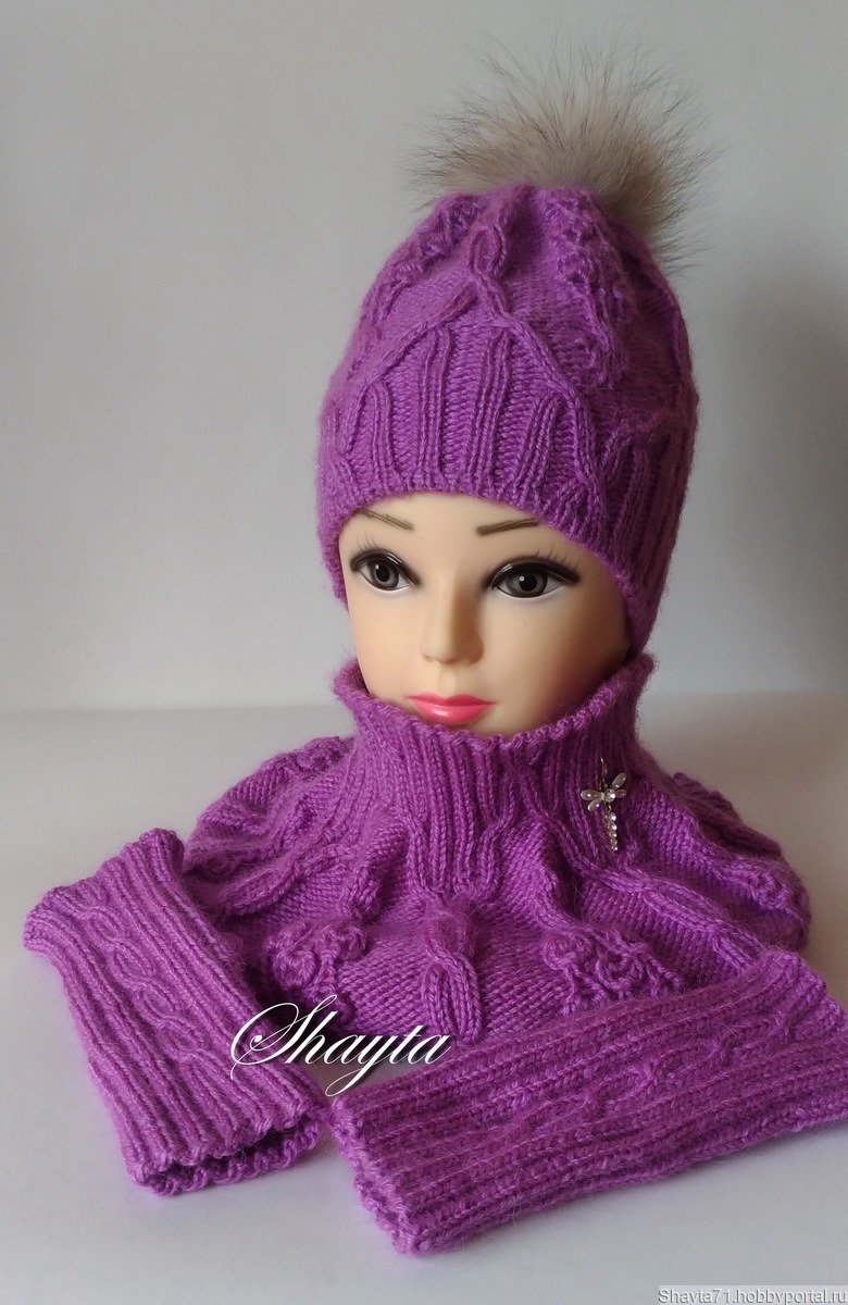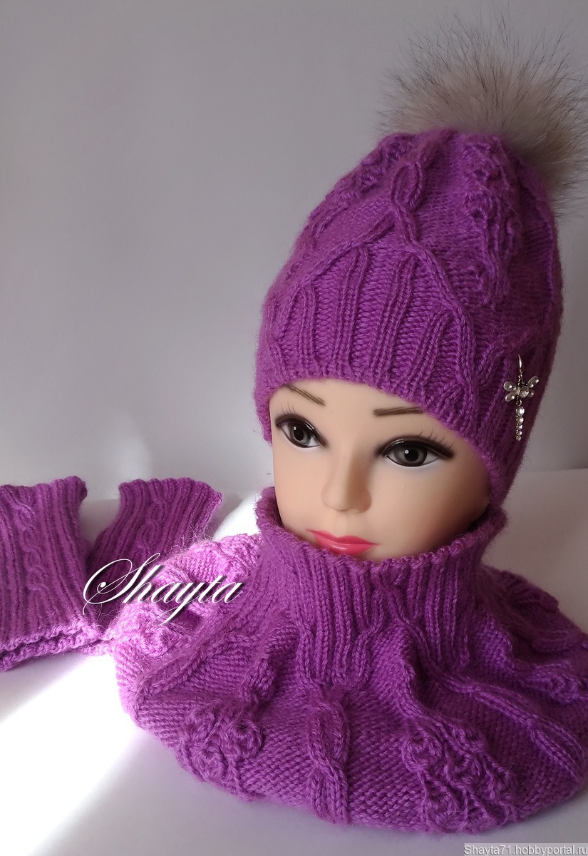 Авторская работа.Комплект состоит из шапки ,снуда,митенок.По желанию - форму снуда можно изменить,а также указать наличие помпона,выбрать цвет.Прикреплённая брошь не продаётся.