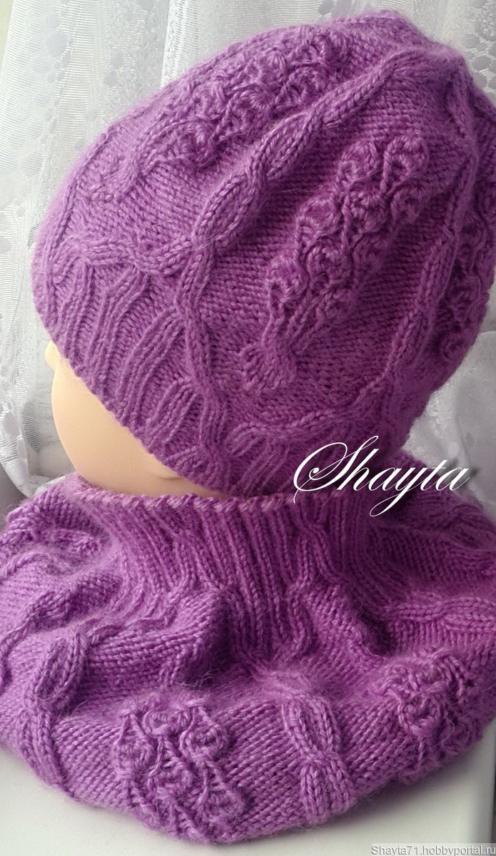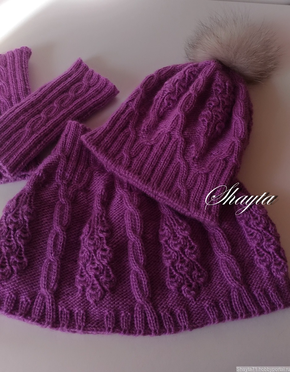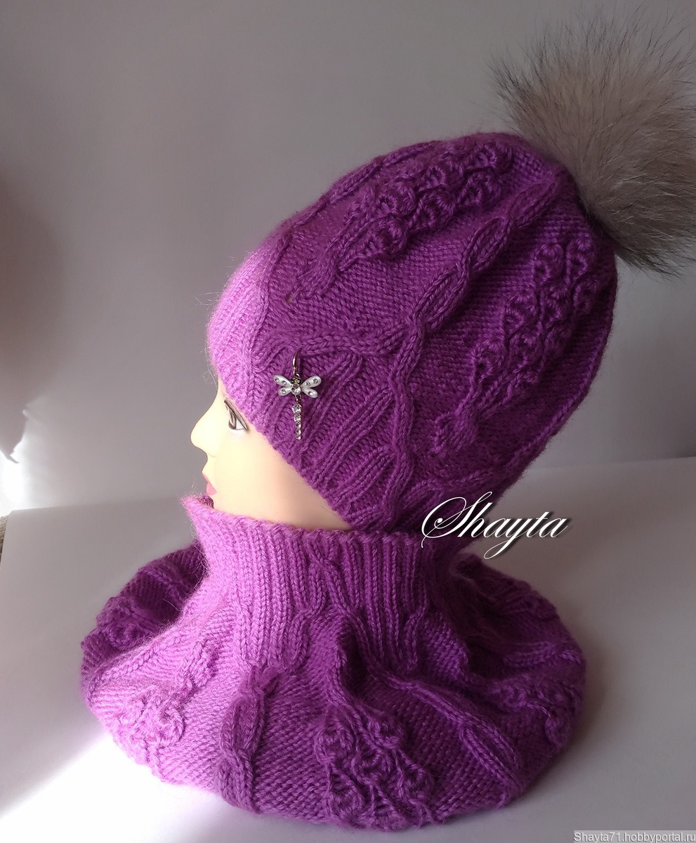 Авторская работа.Комплект состоит из шапки ,снуда,митенок.По желанию - форму снуда можно изменить,а также указать наличие помпона,выбрать цвет.Прикреплённая брошь не продаётся.