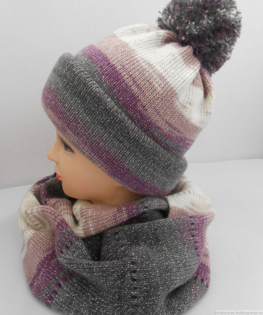 комбинированный, вязаная шапочка, шапочка вязаная, шапка женская, снуд вязаный, снуд шарф хомут, снуд женский, снуд в два оборота, комплект вязаный, комплект аксессуаров, вязаный комплект, вязаный снуд, секционная пряжа, шапочка с помпоном, турецкая пряжа, шапочка и снуд, шапочка с отворотом