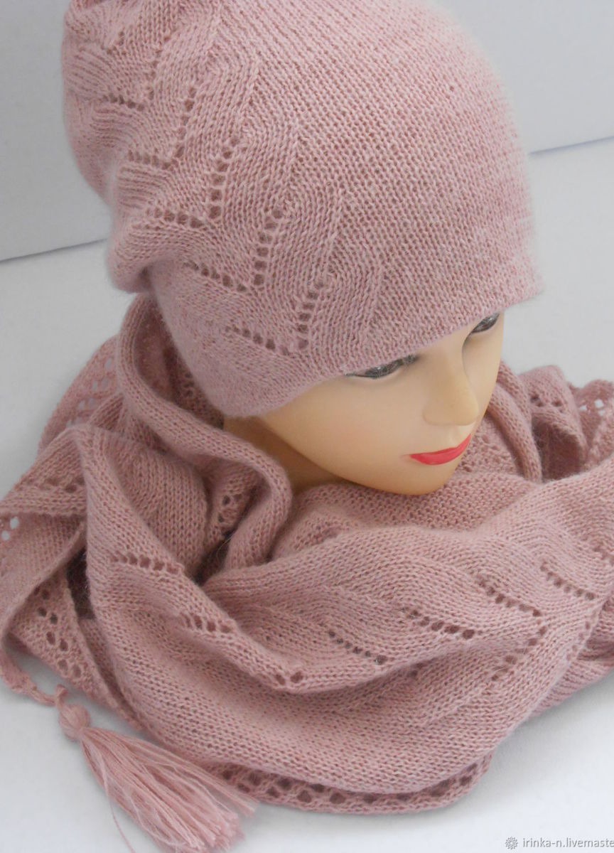 вязаная шапка, шапочка вязаная, комплект вязаный, комплект аксессуаров, комплект на весну, косынка вязаная, теплый комплект, вязаный комплект, шапочка двойная, цвет пыльной розы, комплект с мохером, вязаный шарф-бактус, вязаный комплект купить, полушерсть с мохером, комплект с шапкой, косынка и шапочка вязаные