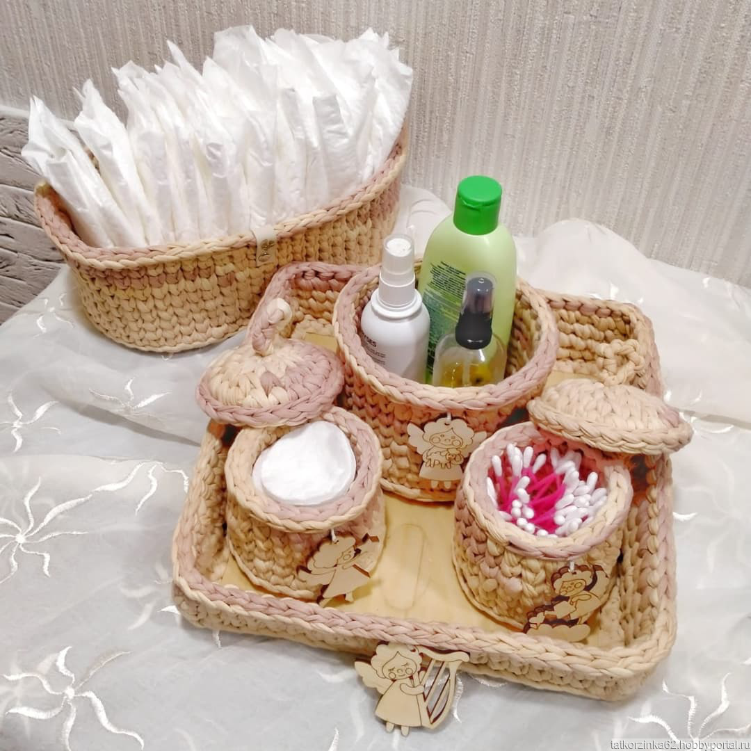 Набор корзин для ухода за младенцем.Выполнен из хлопка, деревянные донышка создают дополнительную устойчивость.