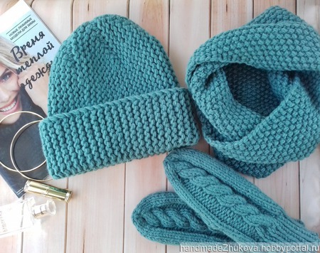 Теплый стильный комплект на зиму. Мягкая шапка крупной вязки, с отворотом (34 см в развернутом виде, на ог 55-58 см), снуд в один оборот (высота 32см), варежки с жгутами.