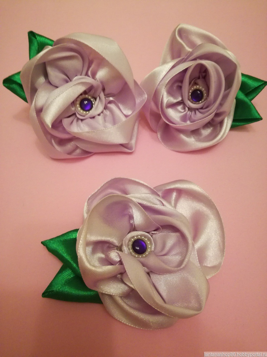 Резиночки для волос + брошь, сделаны в технике канзаши, и атласных лент