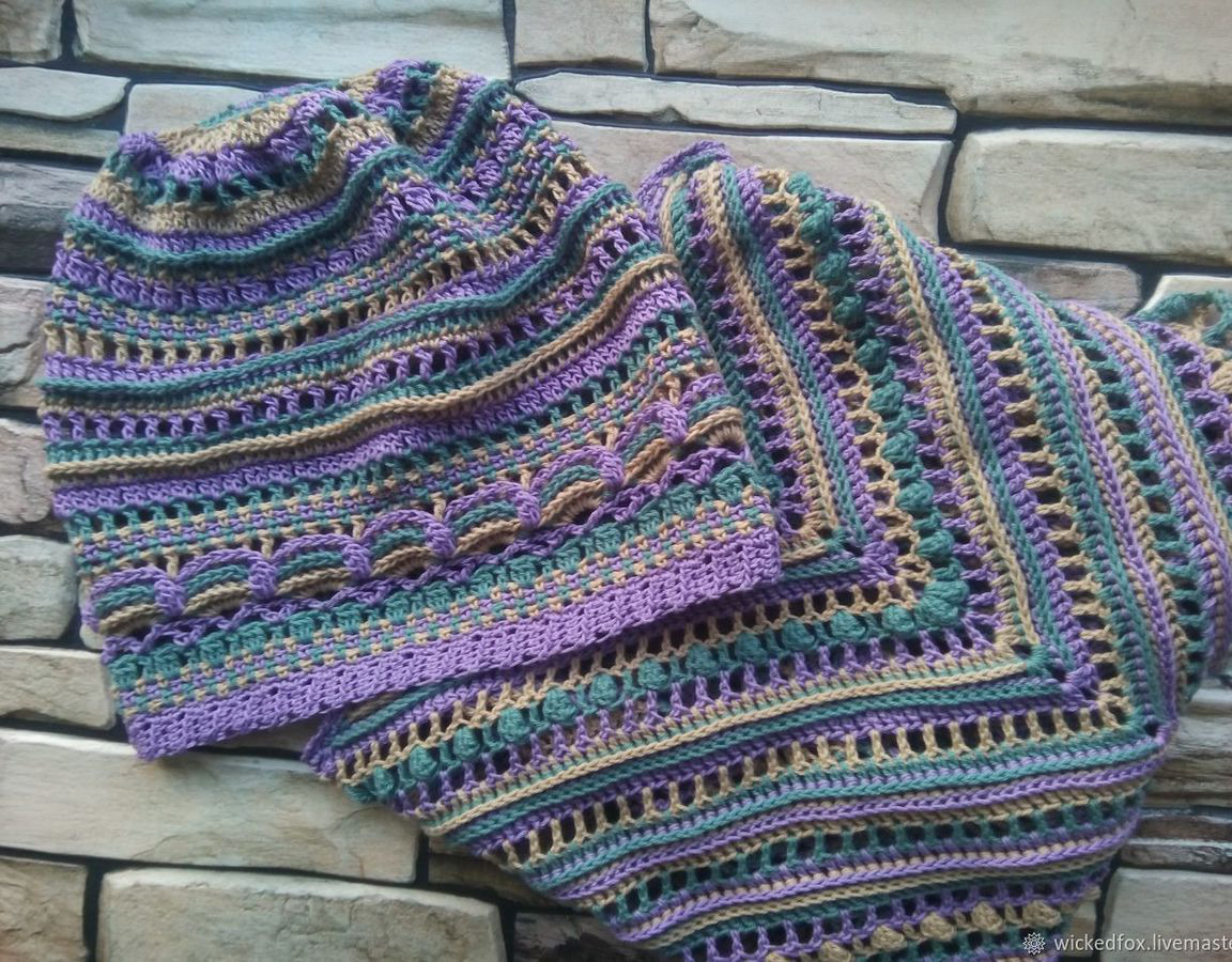 Весенний комплект шапки и шали подарит хорошее настроение и украсит любой образ.Шаль и шапка связаны крючком из хлопка трех цветов : золотистый бежевый, нежный сиреневый и зеленый мох.