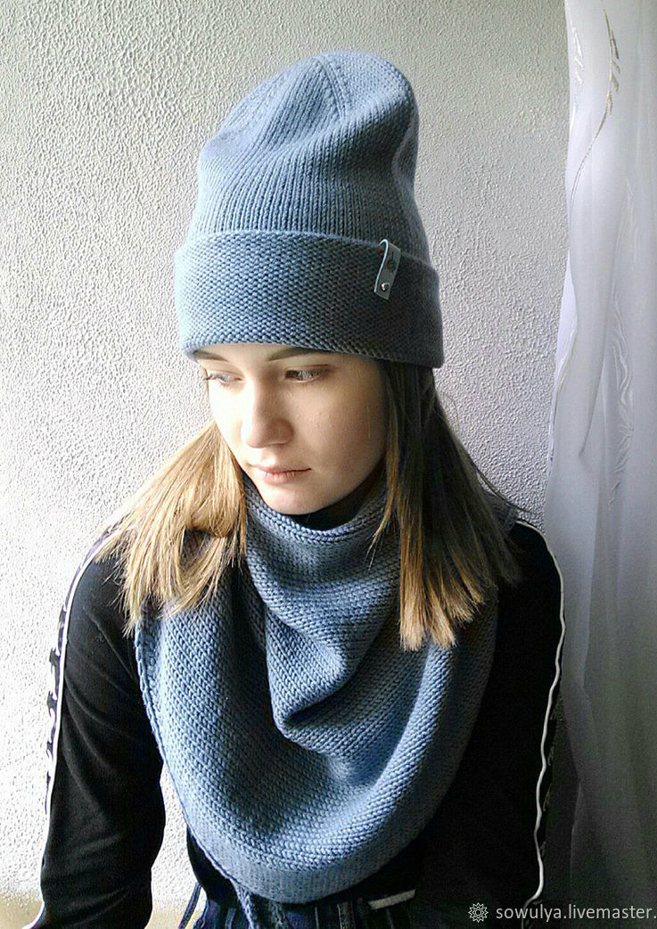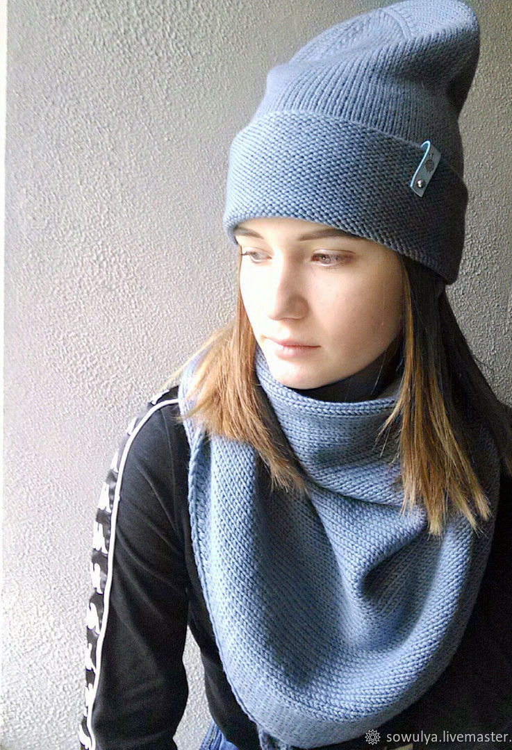 вязаный комплект, вязаный бактус, вязаный платок, шапка бини женская, бини с отворотом, вязаный комплект из мериноса
