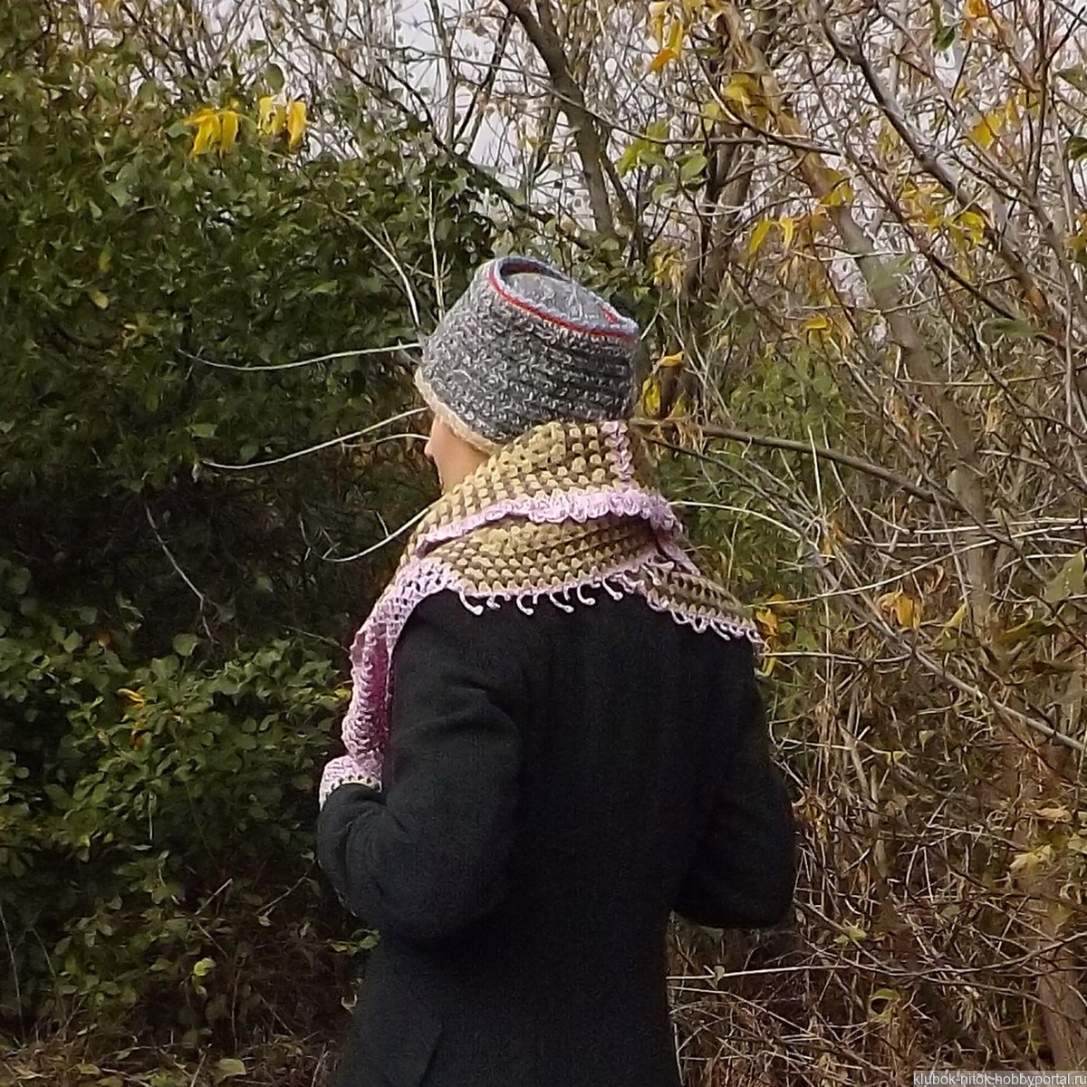 Вязаный шерстяной комплект Донские степи: шаль-бактус в стиле печворк, шапка-кубанка, митенки длинные, с "большим пальцем", митенки напоминают дикую мальву.