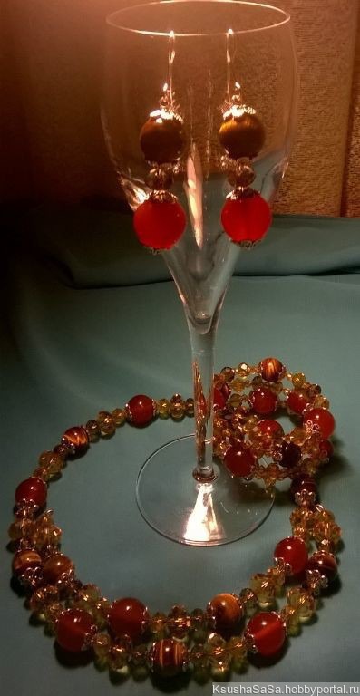 Колье, браслет и серьги. Сердолик, тигровый глаз и декоративное стекло.