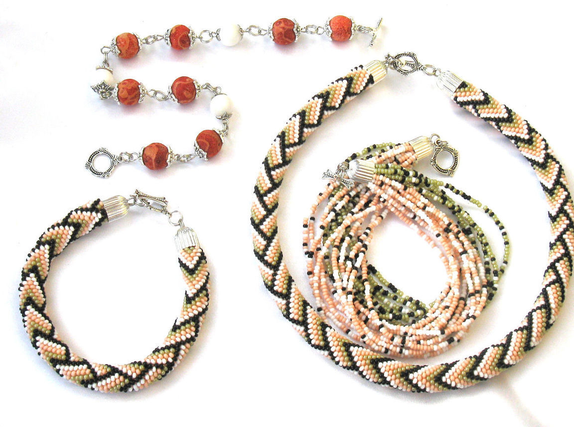 Колье в персиково-оливковых тонах. из чешского бисера . Геометрический рисунок и сочетание белого, чёрного, персикового и оливкового бисера очень гармонично сложились в этом жгутике.