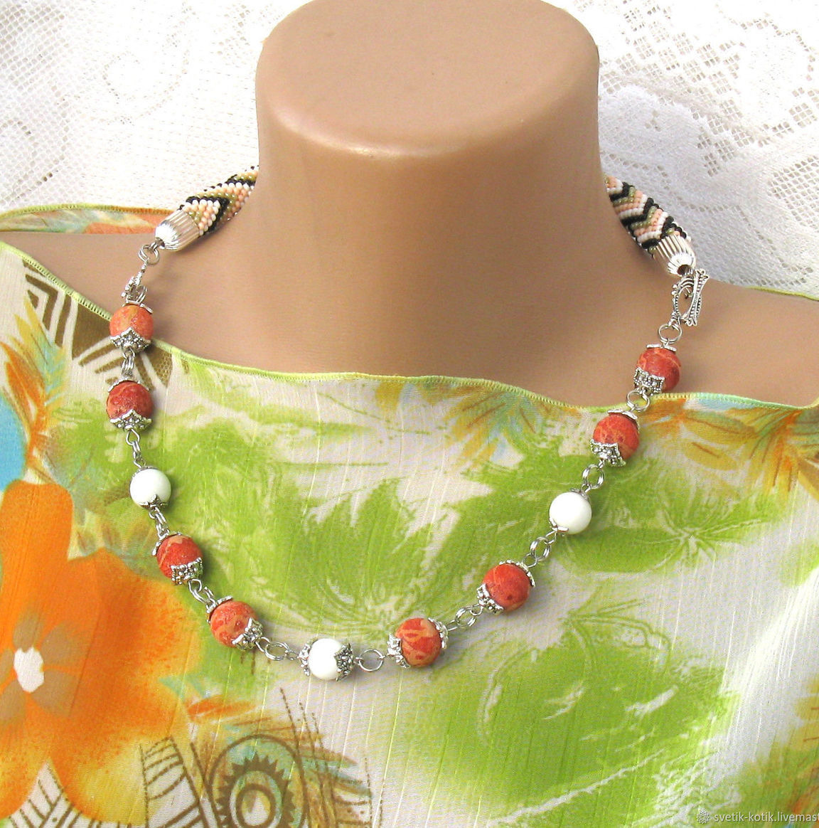 Колье дополнено браслетом, вставкой из бисерных нитей и вставкой с бисинами из натурального коралла и нефрита.