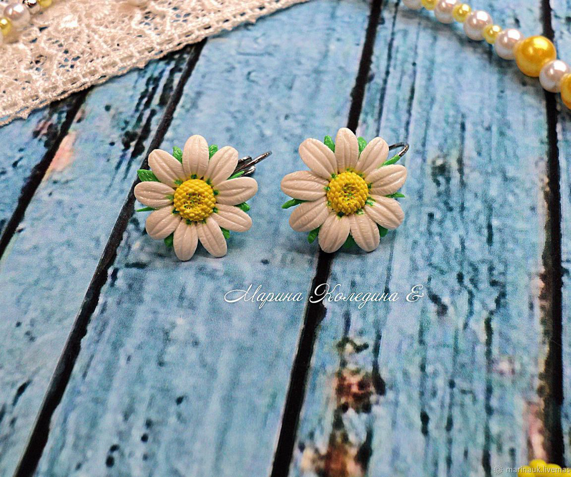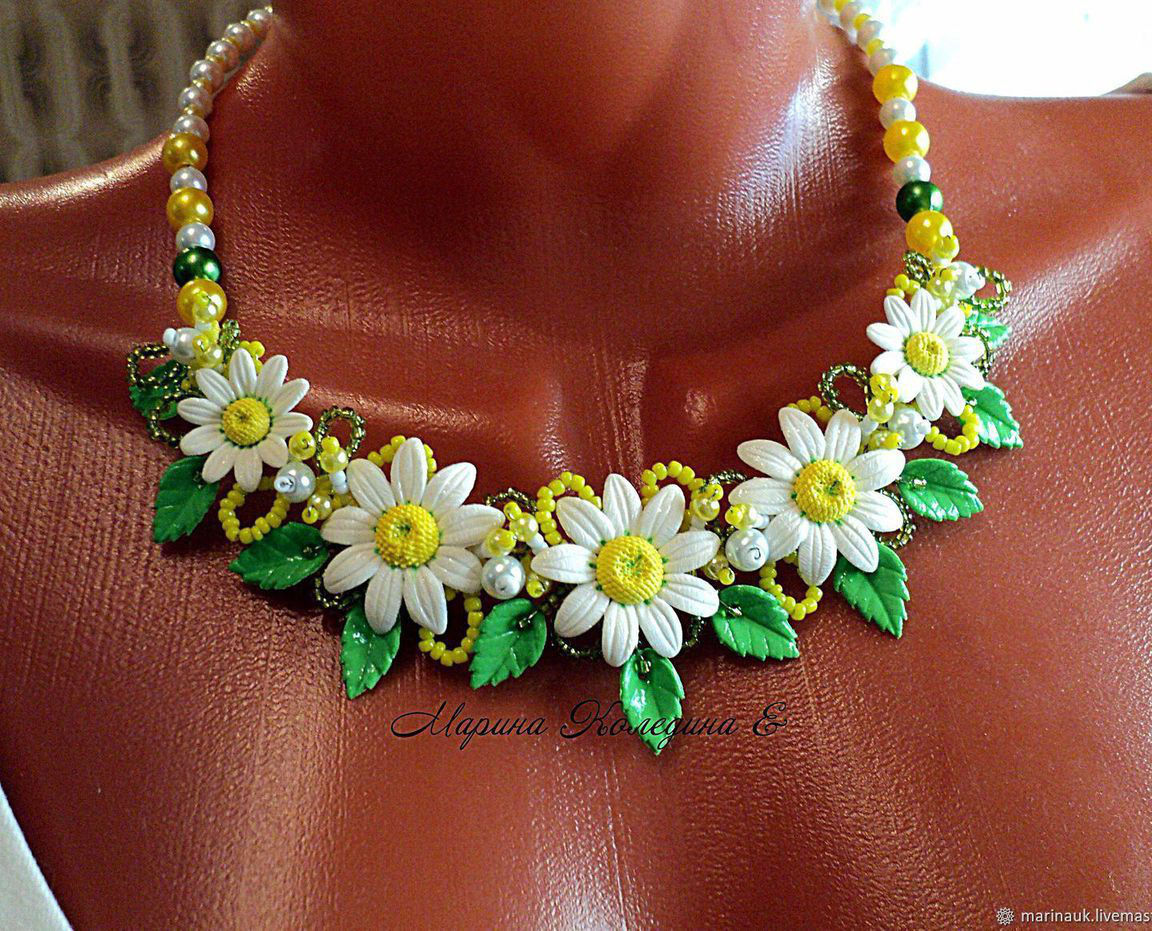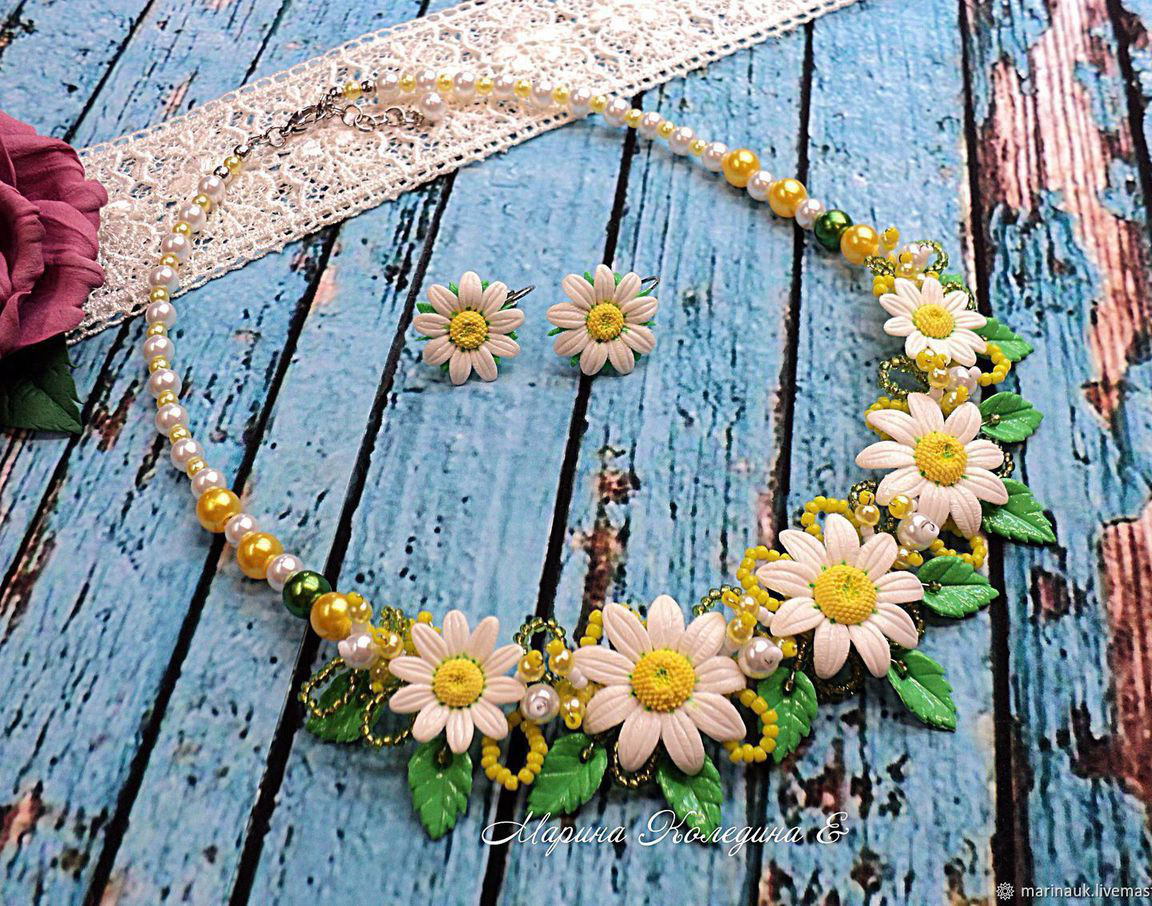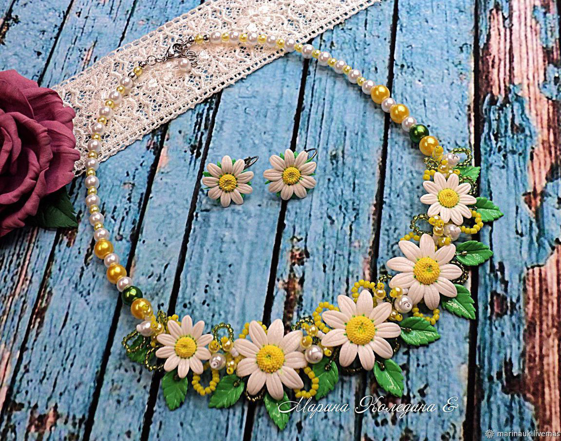 желтый, бусы, лето, цветы, серьги, колье, букет, цветы из полимерной глины, бижутерия, полимерная глина, ромашки, летнее украшение, летний, цветочные серьги, лепка, цветочное колье