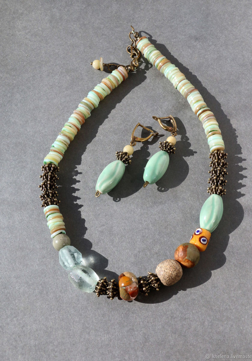 металлофурнитура, стеклянные бусины, эпоксидная смола, керамические бусины, перламутр, яшма