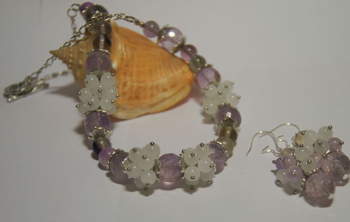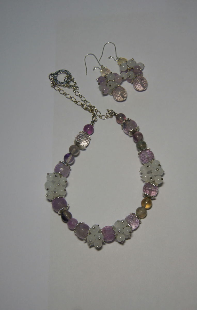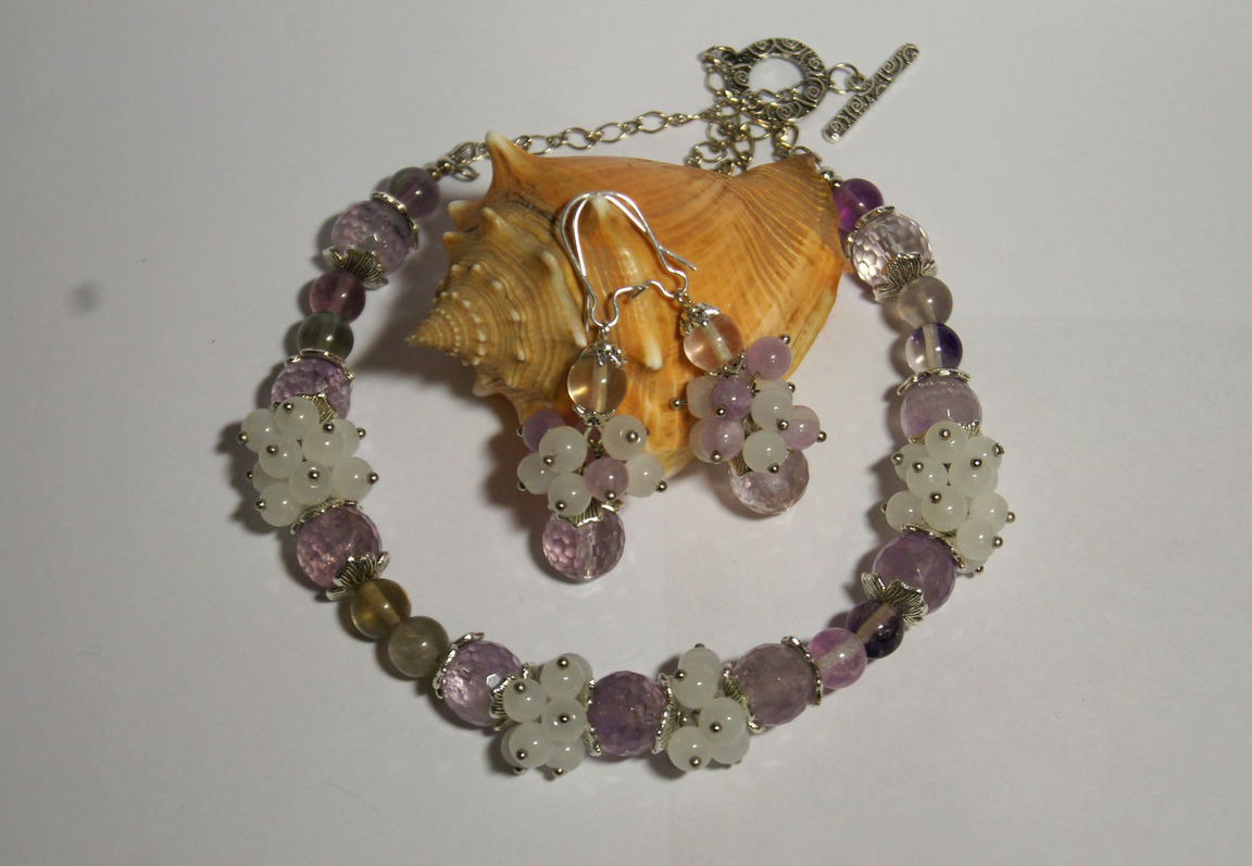 Очень нежный и воздушный комплект из прозрачных ограненных бусин натурального аметиста и флюорита. Очень спокойные тона. Колье собрано на прочный ювелирный тросик. Фурнитура под серебро.