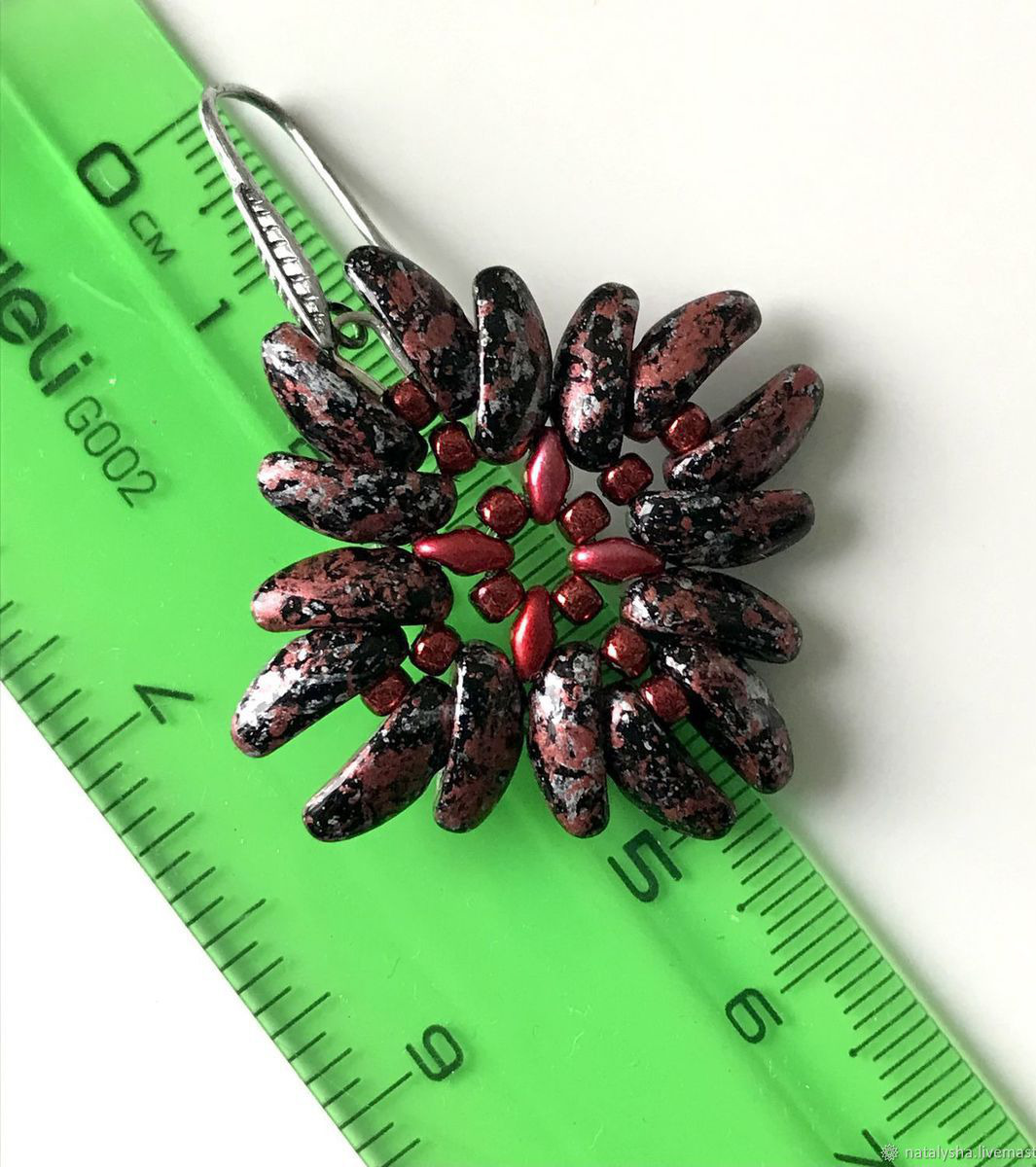 Размер плетеной части по диагонали от/до вершин бусин около 4 см. Размер со швензами чуть больше 5 см (см. фото).