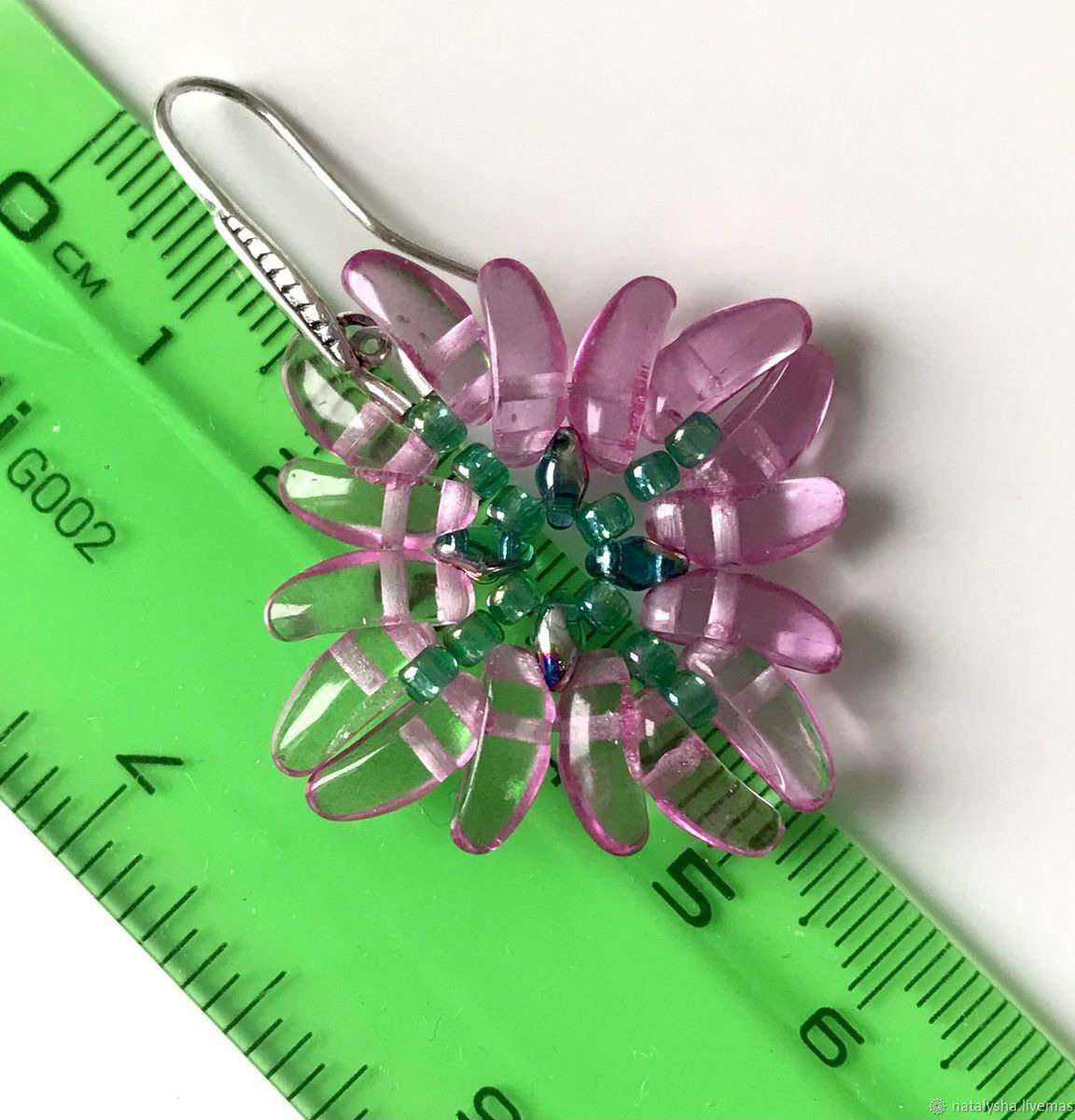 Размер плетеной части по диагонали от/до вершин бусин около 4 см. Размер со швензами чуть больше 5 см (см. фото).