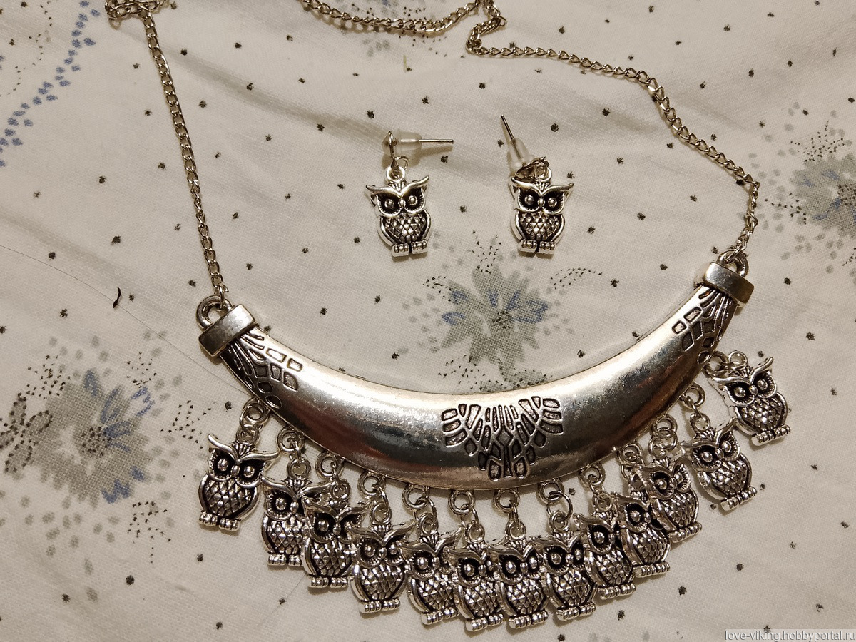 Комплект из колье и серёг с коннектором-полумесяцем и подвесками в виде сов