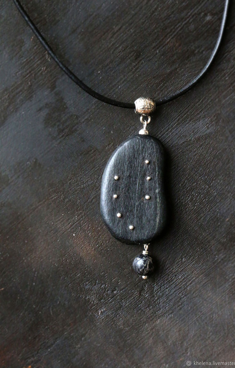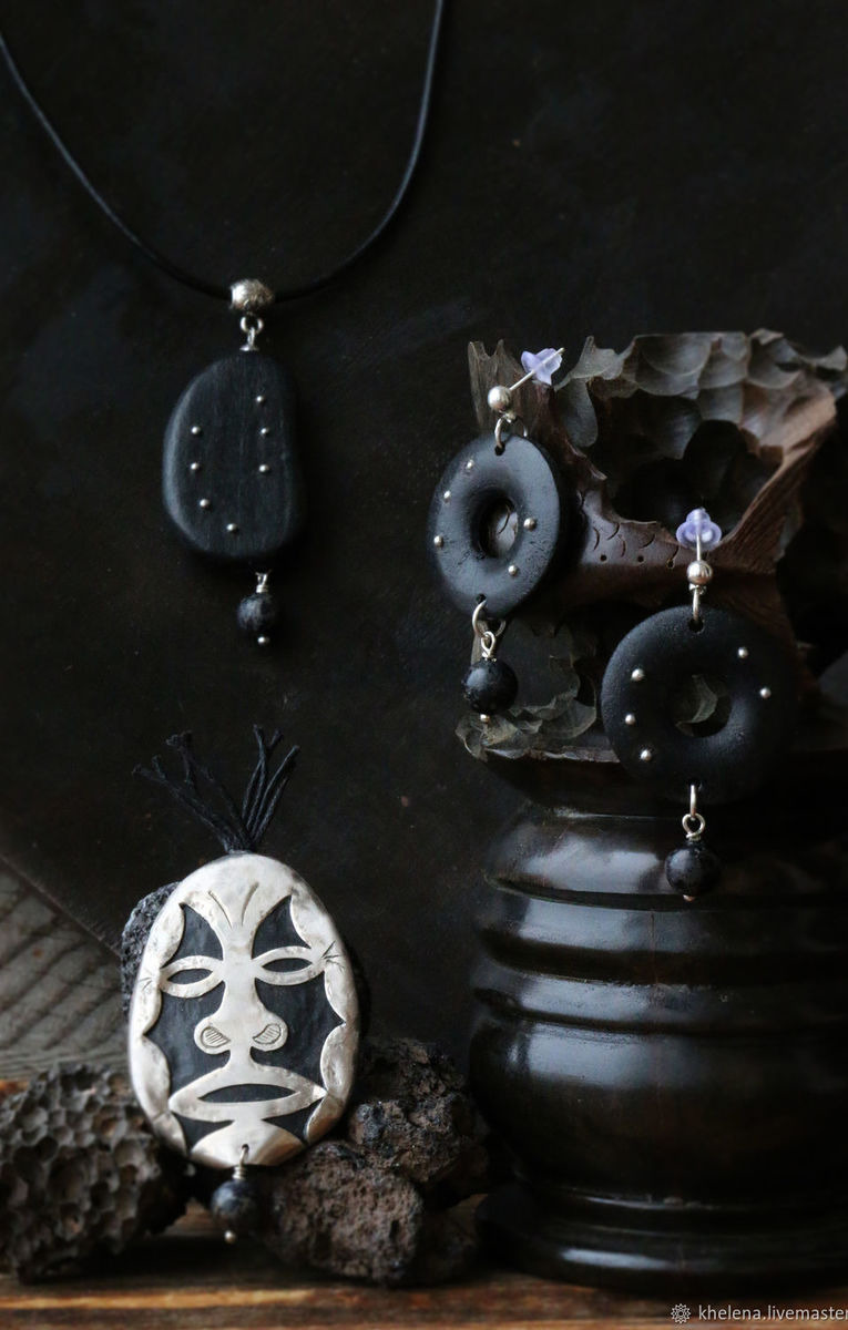 В основе украшений тонированные деревянные бусины от винтажной бижутерии, которые я декорировала элементами всечки с зернью, обновила воском и отполировала. Серьги и подвес дополнены интересными бусинками из имитации яшмы. Кулон размещен на бейле на кожаном шнуре, серьги на шариках-пусетах. Комплект лаконичный, но выразительный. Нейтральный по форме и цвету, он может дополнить образ от классики до любого неформального стиля. Хорошо сочетается с брошью в стиле афро «Dark Mask»