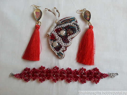 Этот комплект состоит из: 1. Брошь 2. Браслет 3. серьги кисточки