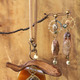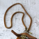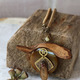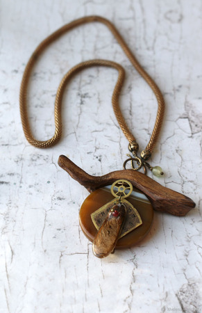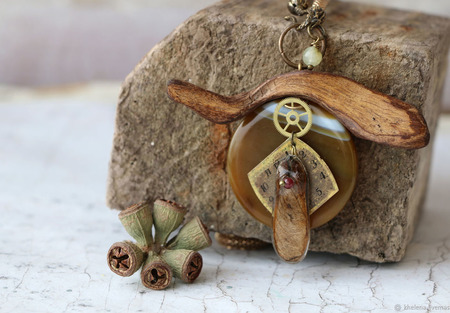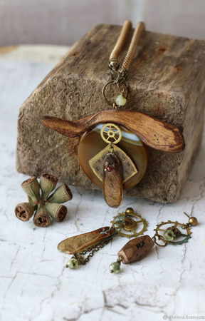 Довольно крупный подвес из морского дерева и тонированного агата, декорированного деталями часов, старым циферблатом и крылаткой ясеня в эпоксидной смоле, которая напомнила мне цикаду. Дополнен небольшим шариком пренита, таким же, как в серьгах. Закреплен на винтажной латунной цепочке, застегивается на крючок спереди.